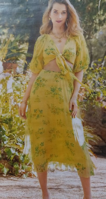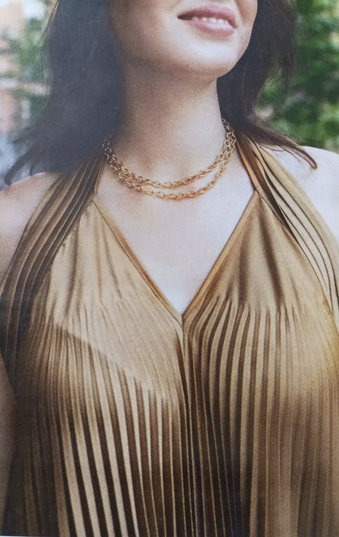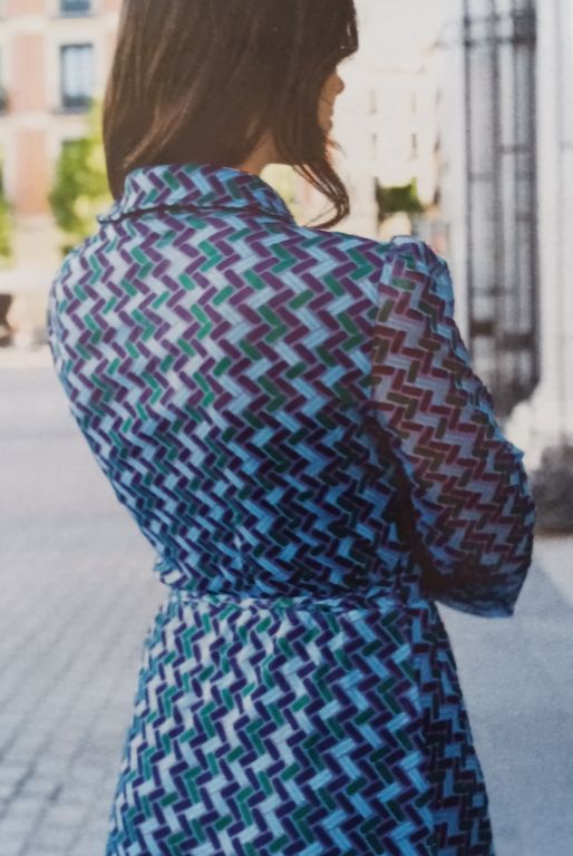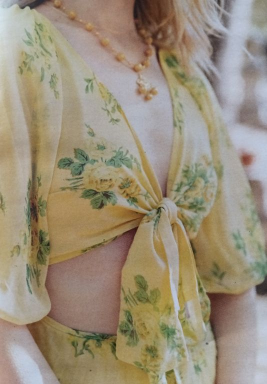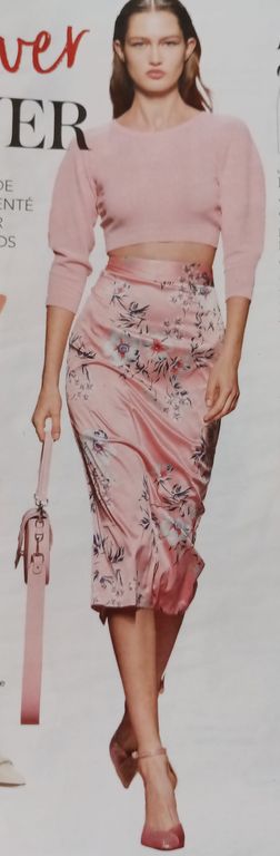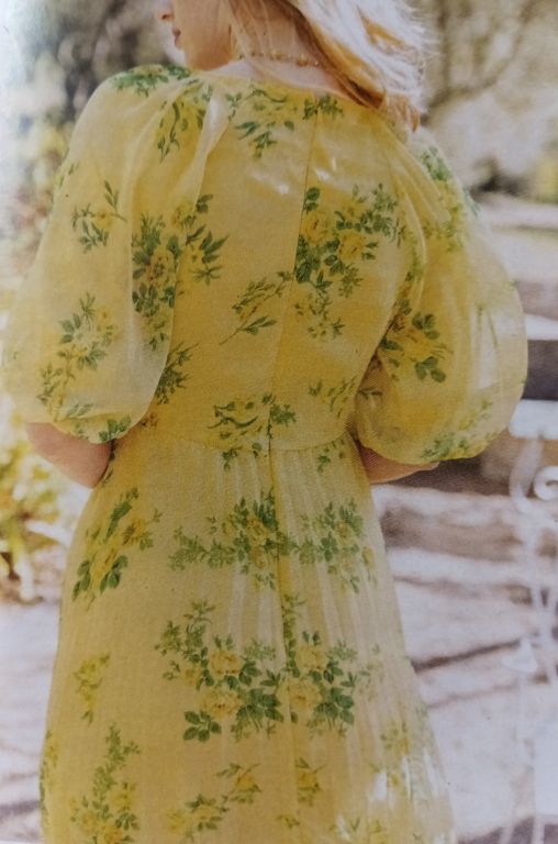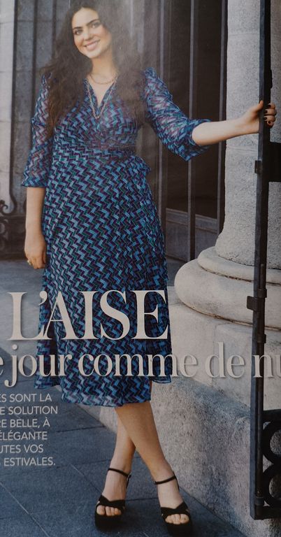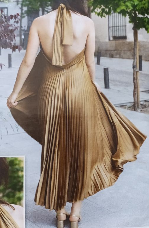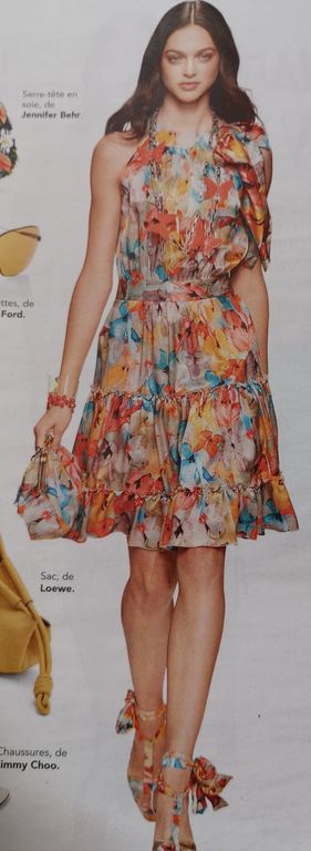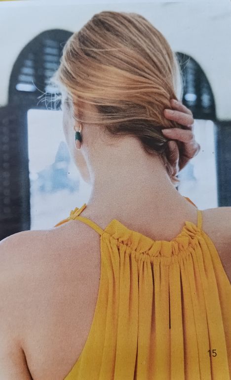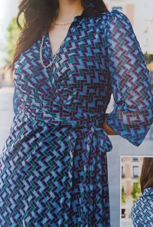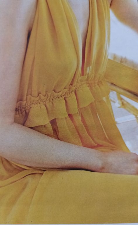 J’adore cette robe qui est sculpturale. Elle est confectionnée dans un tissu plissé après découpes du patron. J’ignore où faire plisser un tissu de la sorte, dans la revue, il est indiqué chez votre couturière… Elle possède une encolure en V avec un parement large à nouer dans le cou.