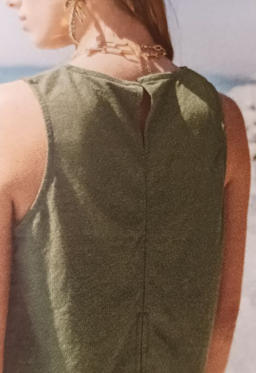 Je salue l’originalité de cette ravissante robe d’été. La base est simple, une robe longue sans manches avec une encolure ronde. Le point de mire se trouve sur le milieu devant un anneau plissé et des ouvertures.