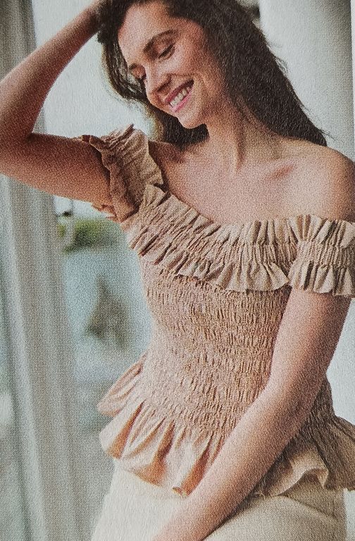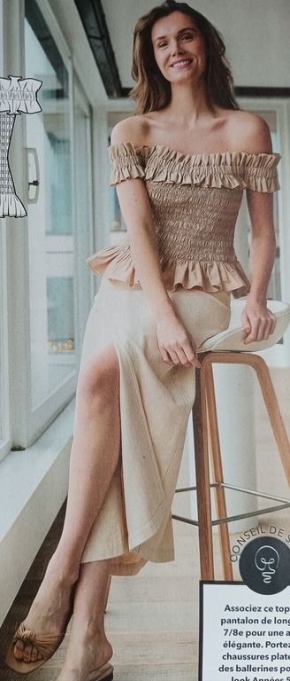 Voici un joli top réalisé à l’aide de smocks élastique. Le corps est moulant sur le buste, avec une petite basque dans le bas. Les épaules sont dégagées et mises en valeur à l’aide d’une large bande élastiquée.