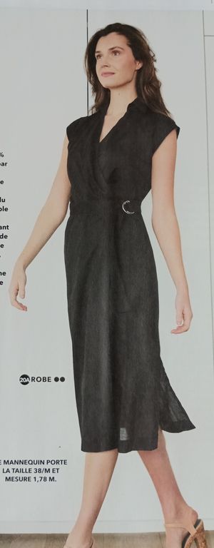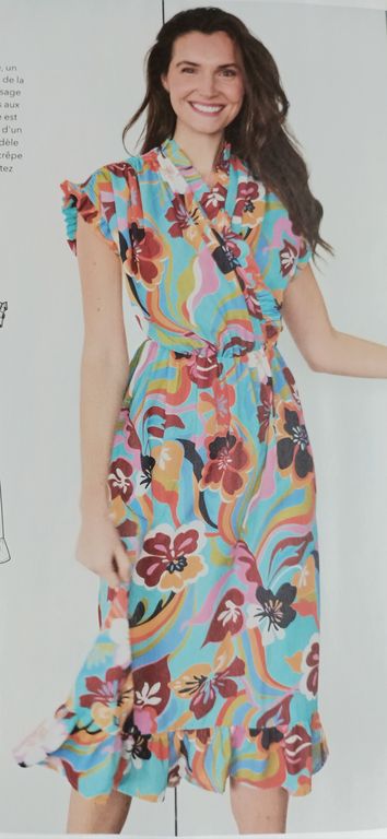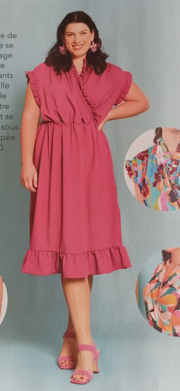 Pour ce coup de cœur, nous avons un modèle de robe cache-cœur et sa variante. La première est froncée à la taille et possède un volant dans le bas de la jupe et des ruchés aux emmanchures et encolures. La seconde est plus étroite et croisée de haut en bas. La profonde encolure en V dispose d’un petit col. La robe se ferme à l’aide d’une ceinture à la taille.