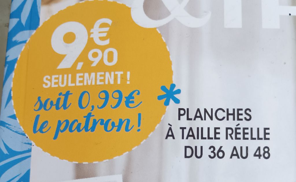 Chez Modes et Travaux, le prix raisonnable est affiché en très gros ! Moins de 10 euros pour 10 patrons de couture. Le panel de tailles va du 36 au 48. Ce qu’ils oublient d’indiquer, c’est que les planches de patrons pour l’été, mais en toute saison sont découpables ! C’est selon moi, le meilleur argument de vente, surtout quand on connait le prix d’un patron pochette…