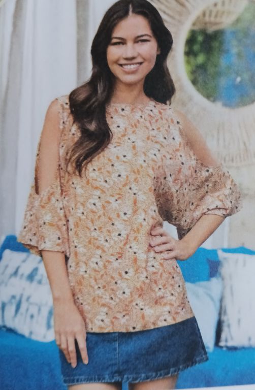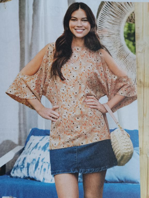 Voici un joli top, avec les épaules découvertes. Il possède une encolure ronde et des manches larges.