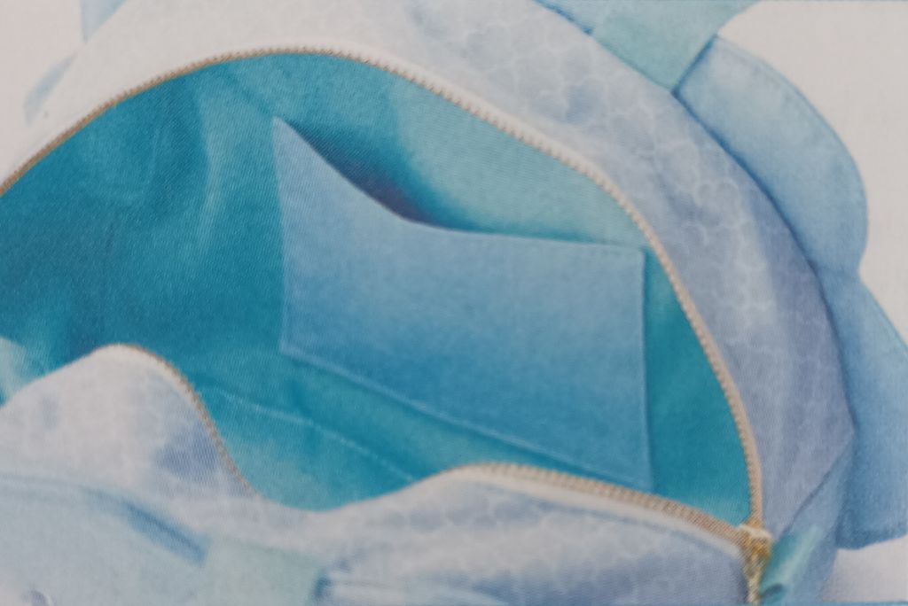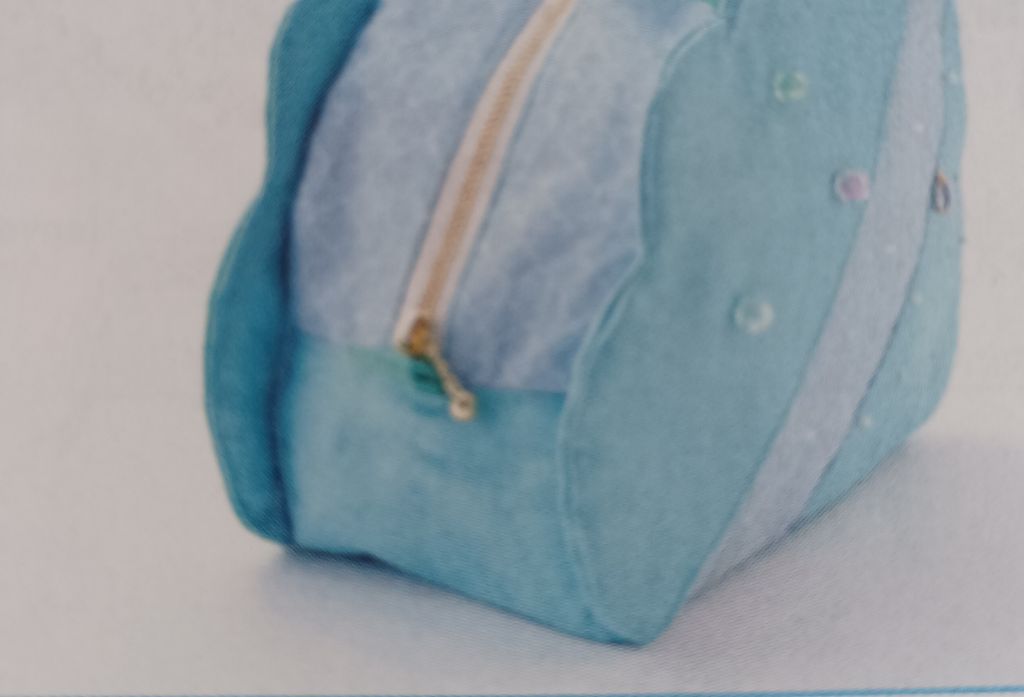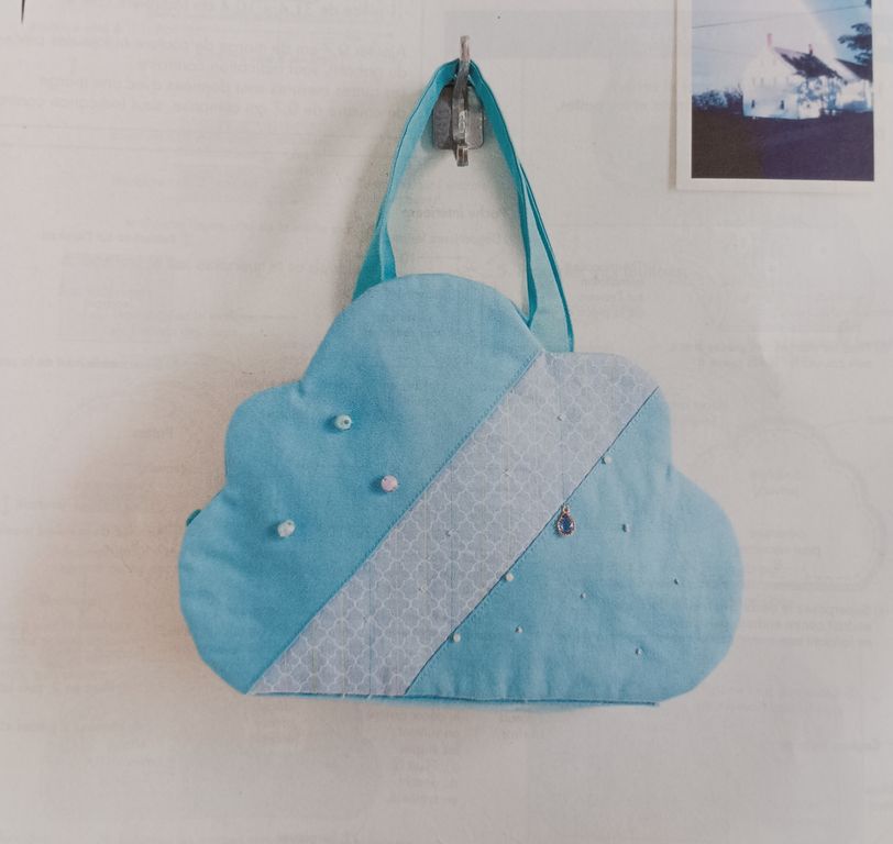J’adore ce petit sac en forme de nuage. Personnellement, j’aurais mis de la couleur pour la bande de tissus qui coupe le nuage. Les gouttes de pluies sont symbolisée par des petites perles. Le sac se ferme à l’aide d’un zip.