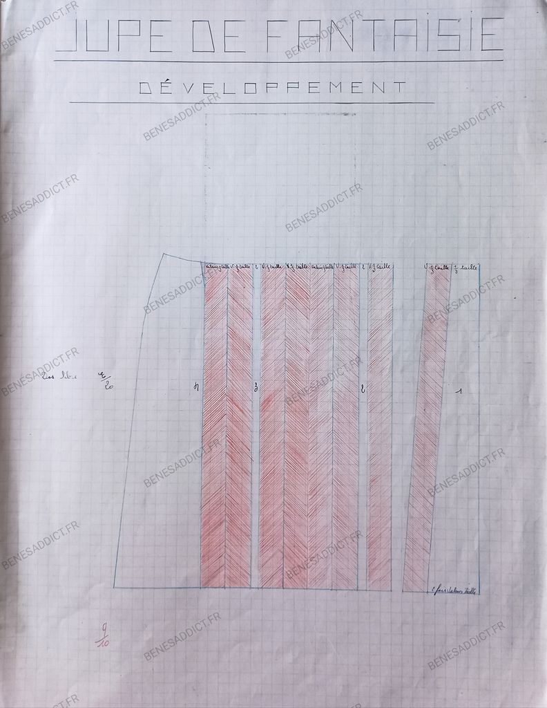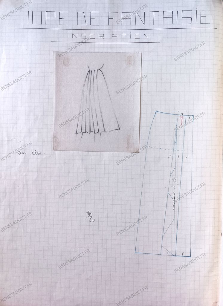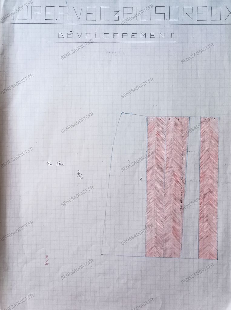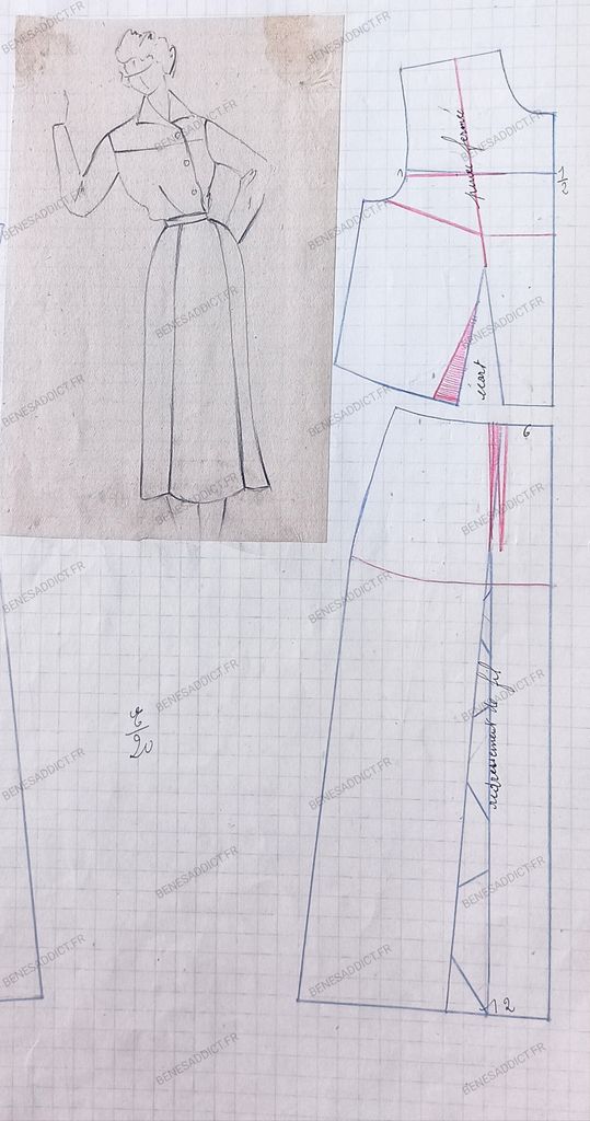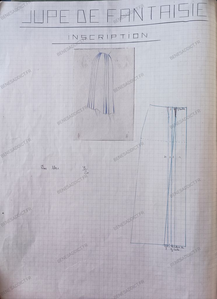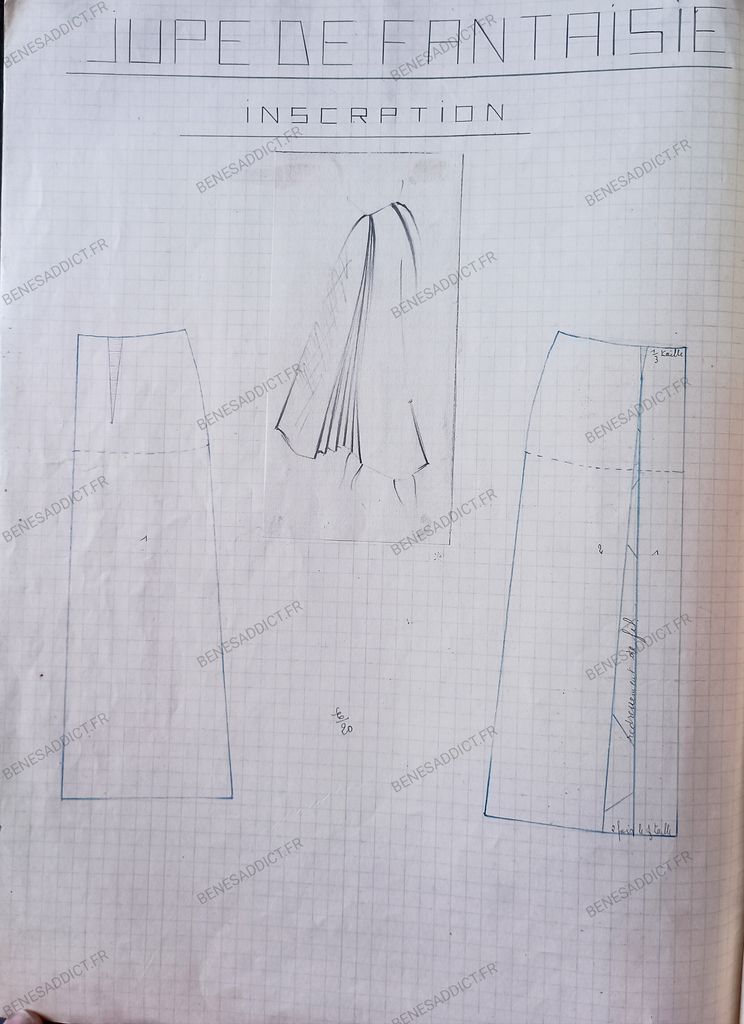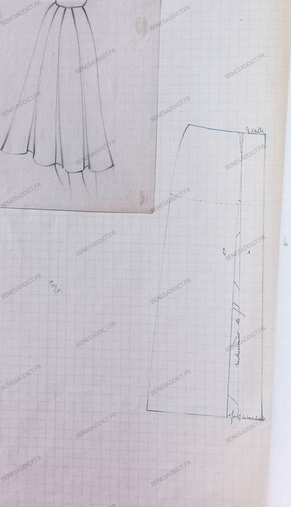 Je pense qu’il date de la fin des années 40. Dites-moi si je me trompe. J’aime beaucoup ce genre de pépites, contrairement à un livre, le temps passé pour réaliser les dessins permettaient de bien s’imprégner des modifications et transformation pour arriver au résultat voulu. On peut y apprendre le tracé du patron de base de la jupe et du corsage, de ces deux bases, on peut créer une infinité de patrons de jupes, corsages, mais aussi vestes et robes.