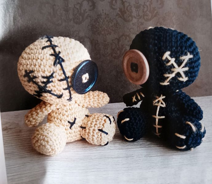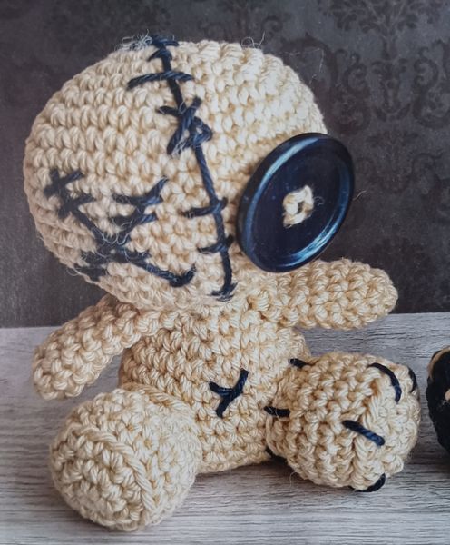 On continue avec la petite poupée vaudou, elle aussi toute en mignonitude. Elle possède un œil en bouton. Tout en rondeur, elle me fait penser à la poupée de Lilo dans le dessin animé Lilo et stitch.