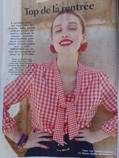 La présence d’un patron papier a fini de me convaincre. Il s’agit d’une blouse à lavallière et manches trois quarts. Le côté rétro est accentué par l’utilisation de deux tissus imprimé en Vichy de même couleur, mais avec des tailles de carreaux différentes.