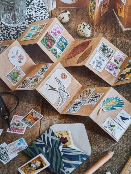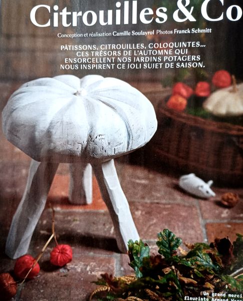 Avec l’arrivée prochaine de l’automne, les coloquintes, et autres cucurbitacées vont s’inviter dans notre assiette ou la décoration. Ici, elles sont particulièrement mises à l’honneur, avec entre autres choses, une jolie broderie. Les timbres sont aussi une source d’inspiration auxquels je n’aurai pas pensé. Ils se retrouvent dans différents domaines créatifs.