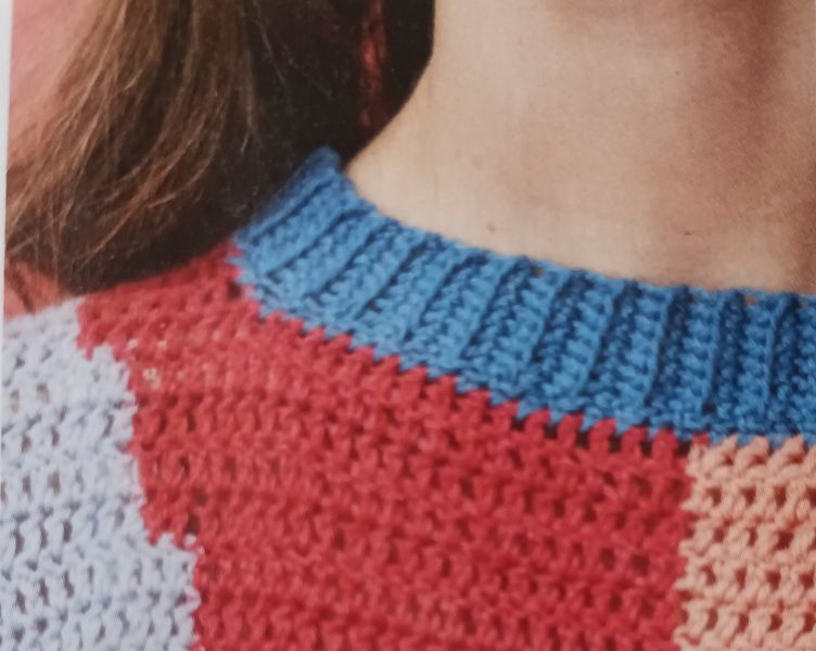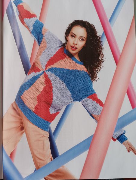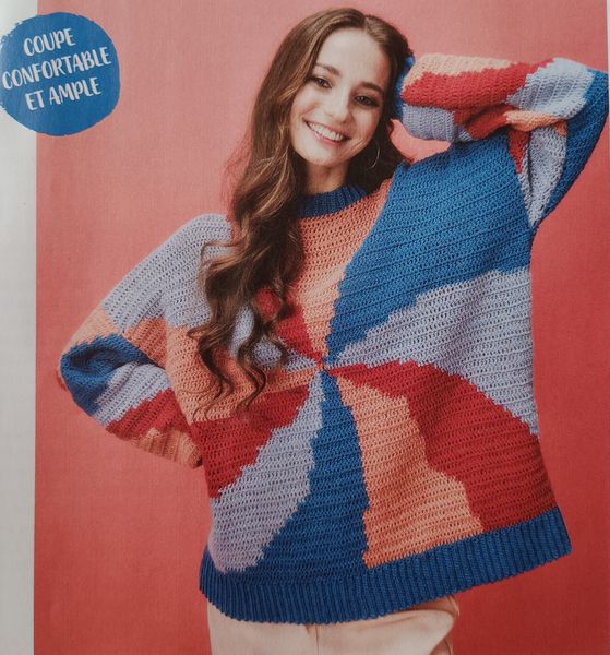 J’adore ce pull avec le dessin de spirale coloré. Même sans reproduire le schéma, nous avons une belle base à décliner à l’infini. Le pull est bien ample, avec de »s manches longues et une encolure ronde.