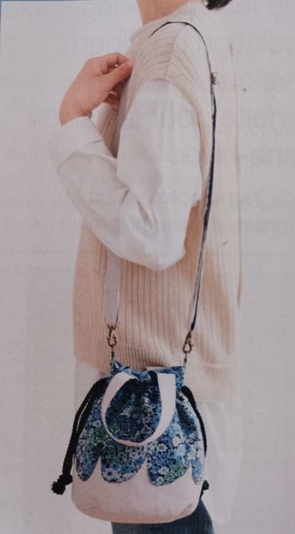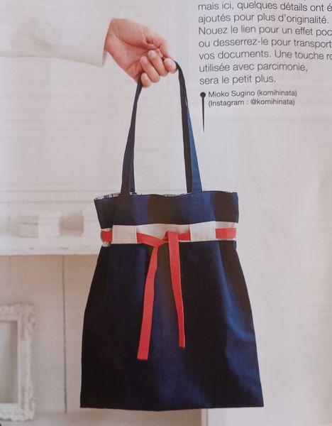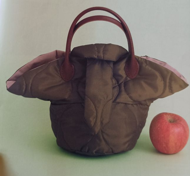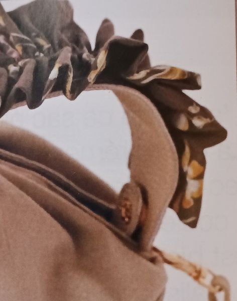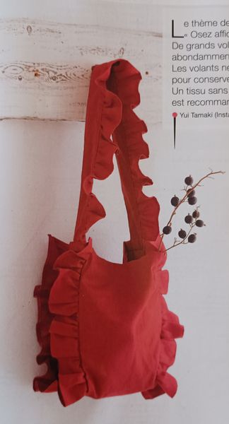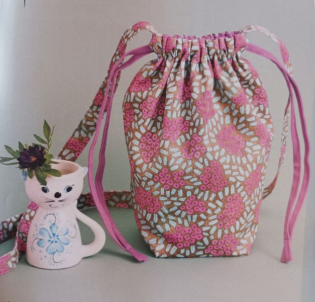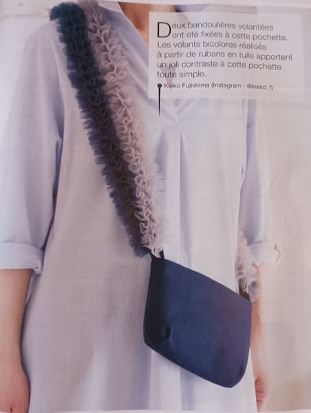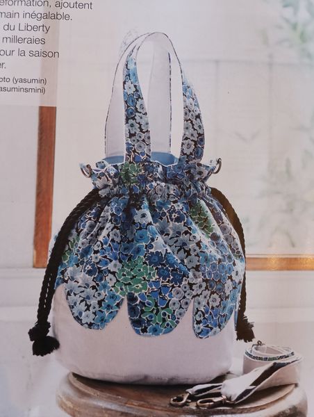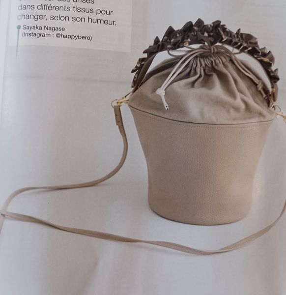 Ce sac seau avec sa forme fuselée me fait penser aux sacs des années 50. Très précieux et raffiné, la partie haute se ferme à l’aide d’un lien sous coulisse, façon bourse. La poignée est garnie de tissu froncé, je ne sais pas si c’est bien pratique, mais c’est ravissant.