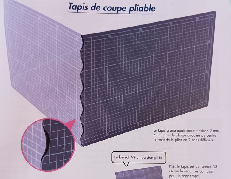 J’ai découvert, une règle spécialement conçue pour être utilisé avec le cutter rotatif ! Au passage, j’ai trouvé ce tapis de coupe pliable aujourd’hui à Aldi pour moins de 7 euros. Il est au format 2 fois A3.
