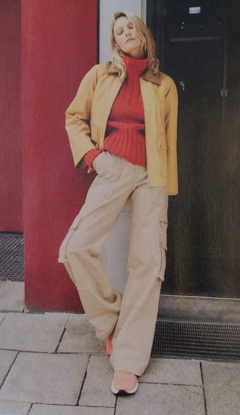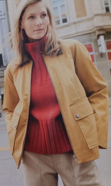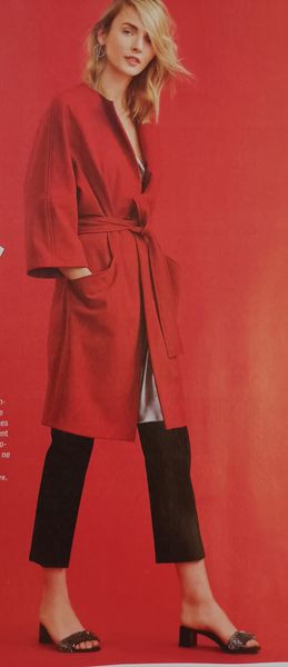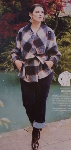 J’aime beaucoup cette veste. Elle peut être portée avec les pans du col à plat et nouée avec une ceinture à la taille. Ou alors, en remontant le col et en l’attachant avec un bouton.