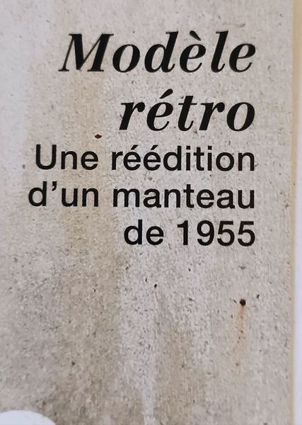 J’adore ce bloc titre qui nous informe sur la couverture de la présence d’une réédition d’un manteau de 1955. C’est une de mes décennies préférée. La mode est un éternel recommencement n’est-ce pas !