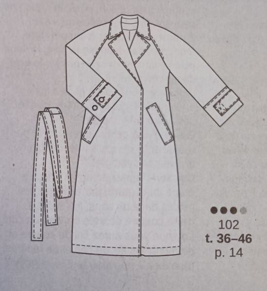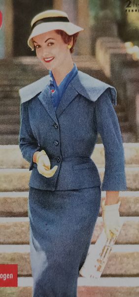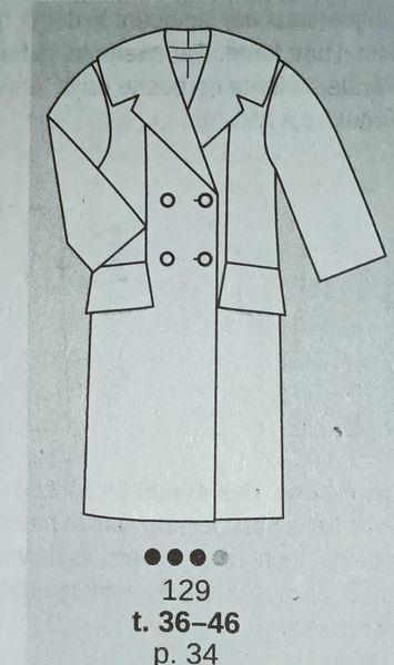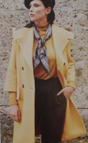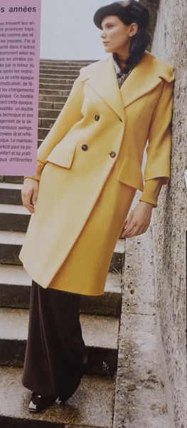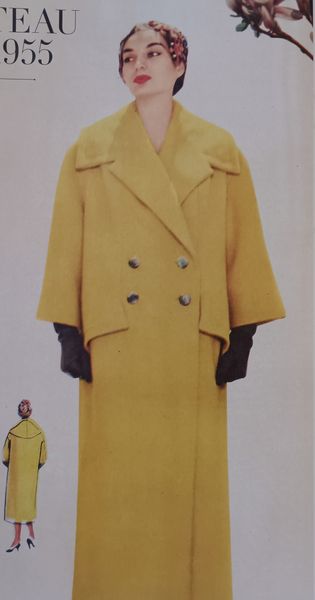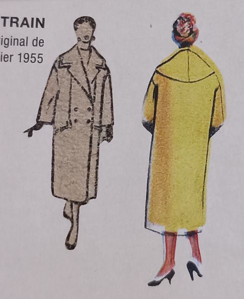 Les années 50 ont été une décennie intéressante pour la mode. Le modèle rétro original est sorti en 1955, chez Burda! Il possède un très large col châle cranté. Ce col parait encore plus grand, grâce au double boutonnage. Il possède une découpe verticale qui s’arrête aux larges revers de poches.