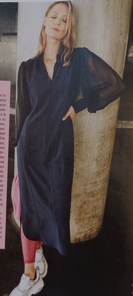 Cette robe chemise est toute simple, mais quelques détails ajoutent de la nouveauté. Ici, nous avons une fente sur les côtés avec des ourlets arrondis. Les manches sont amples, et froncés à la tête de manches et aux poignets. Ces derniers sont cousus de façon à laisser une ouverture pour le pouce, façon mitaines.