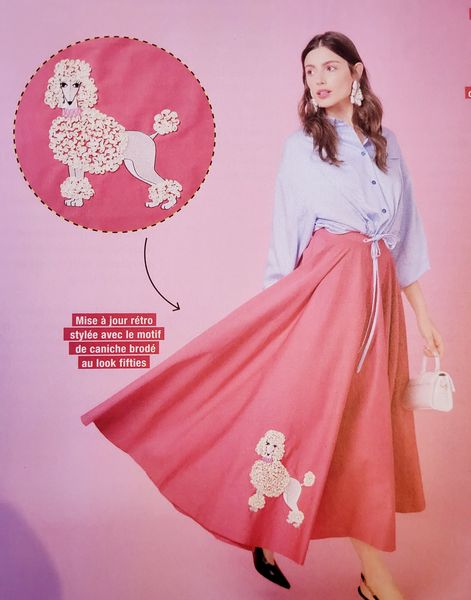 La jupe cloche a révolutionné la mode des années 50. Modifiant radicalement les silhouettes, et laissant le champ libre à l’imagination. La taille marquée façon corselet est ultra-féminine. Le petit caniche brodé sur cette pièce reste iconique.
