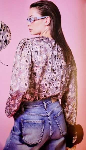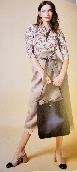 Je vous ai déjà dit que j’aimais beaucoup les hauts avec basques ? Non, hé bien, j’adore ce chemisier venu des années 50. Il se boutonne dans le dos et possède un col Claudine et des manches ballons et une basque froncée à la taille.