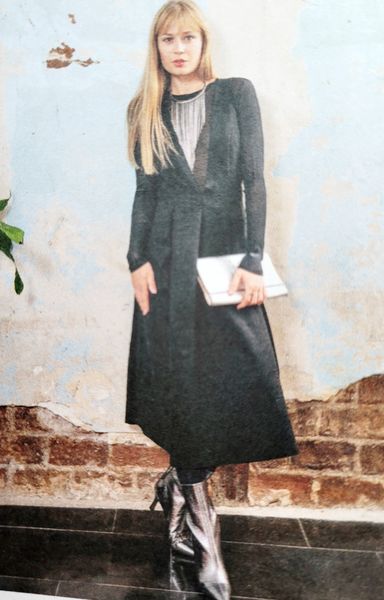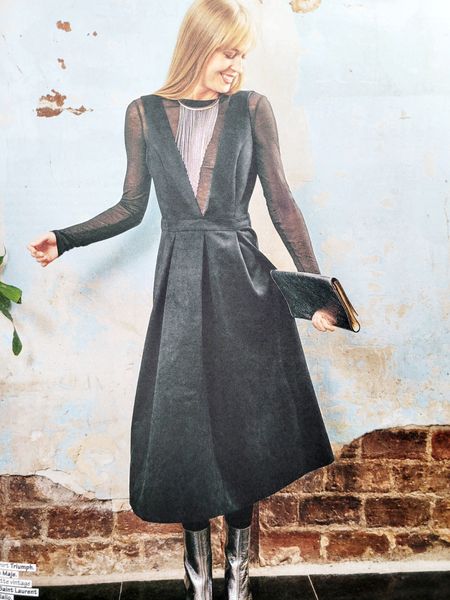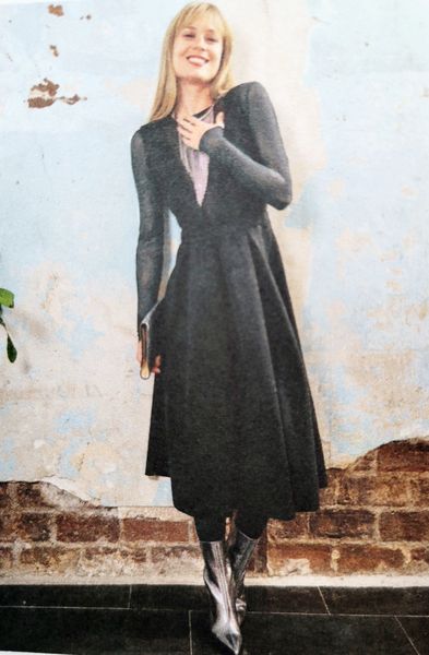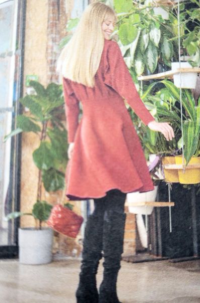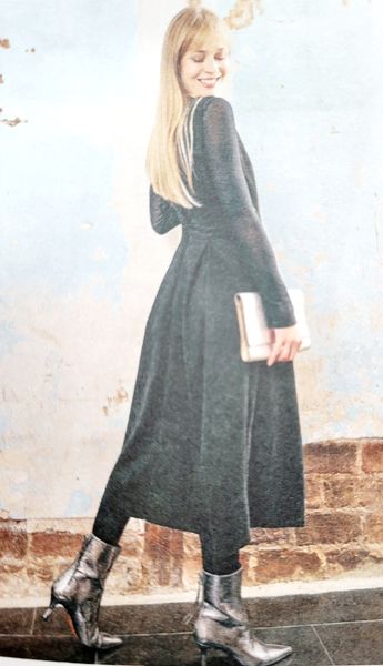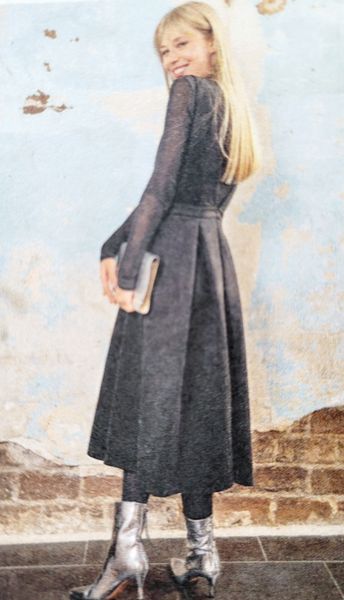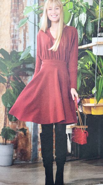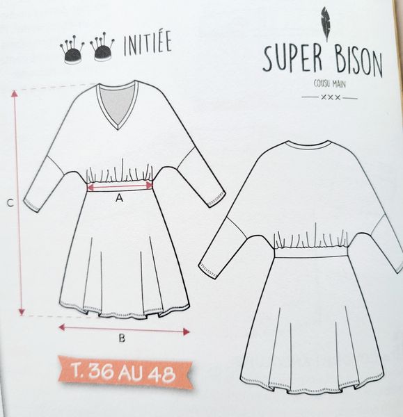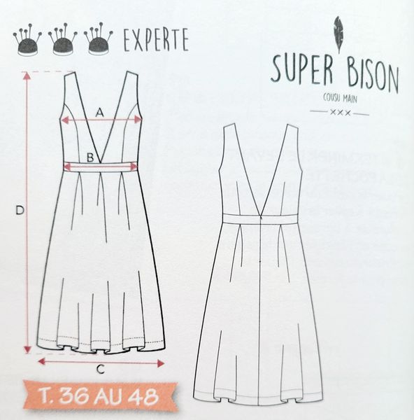 Lorsque j’ai vu le dessin technique de cette robe, je me suis dit ! Ha oui quand même un sacré décolleté puisque celui-ci en V descend jusqu’à la taille dos et devant. Mais finalement, j’ai vu les photos et j’aime beaucoup le résultat et l’idée de porter un haut dessous à manches longues ou courtes et même col roulé tout est permis. La Jupe est garnie de plis creux.