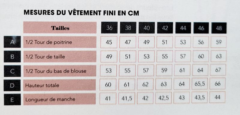 En plus du tableau des tailles, nous avons aussi le tableau des mesures du vêtement fini. Comme vous pouvez le voir sur l’image ci-dessous, beaucoup de mensurations sont prises en compte.