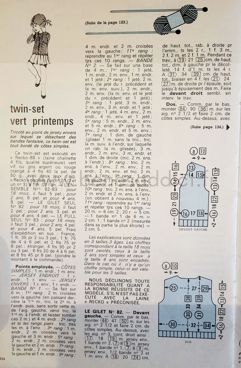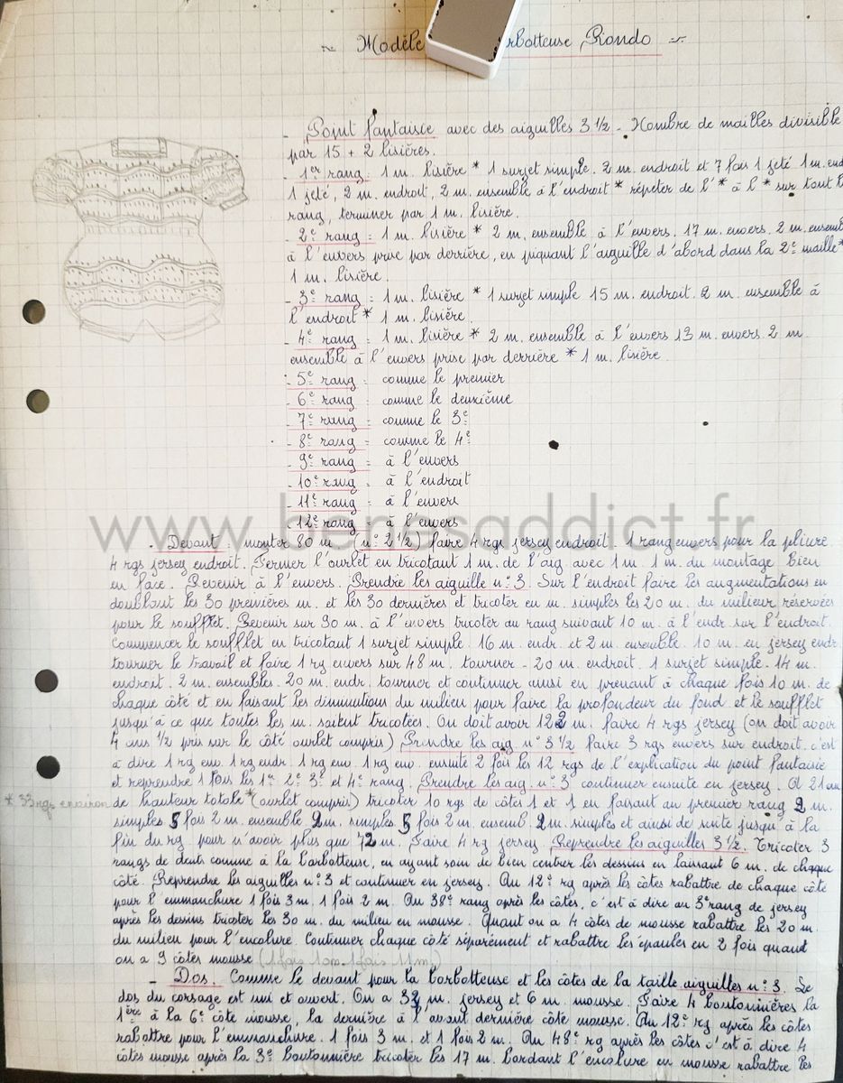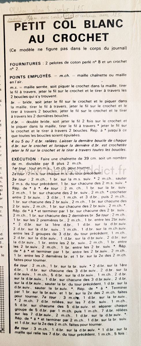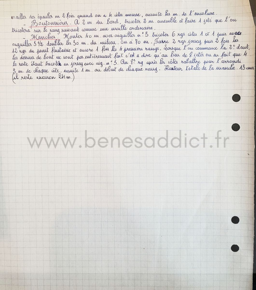 Je pense qu’ils sont tirés de revues Modes et Travaux de l’époque. C’est toujours intéressant de feuilleter et de photographier ces pochettes de morceaux choisis. Épinglés ensemble et souvent annotés. Il m’en reste encore beaucoup à compiler, un peu orientées broderies, mais toujours loisirs créatifs. Je peux comprendre que le choix était de conserver le plus important dans les revues de ces années. J’imagine que le reste des ouvrages ont malheureusement fini au feu comme fréquemment. Enfant, nous avions dans notre immeuble un poêle à charbon, et tout y passait, pas de déchets… Mais des conduits particulièrement encrassé…