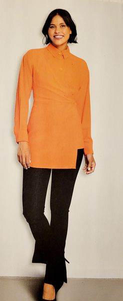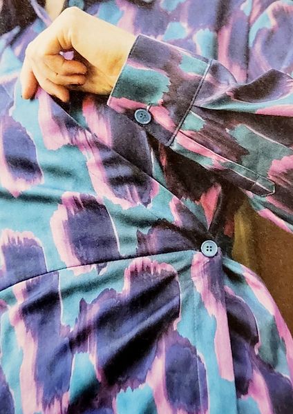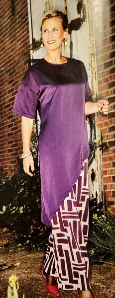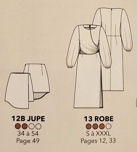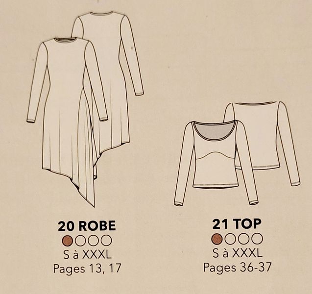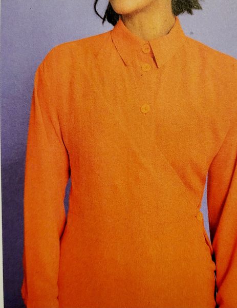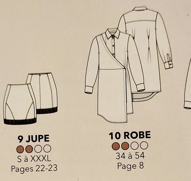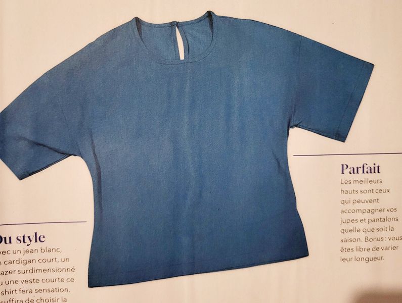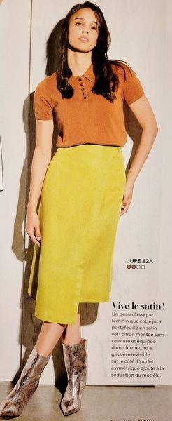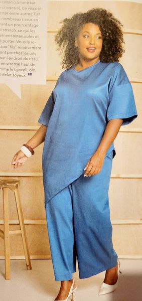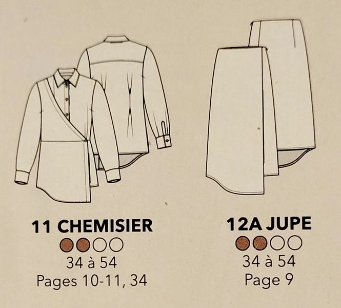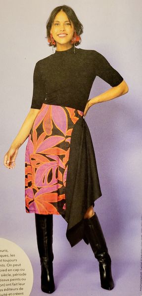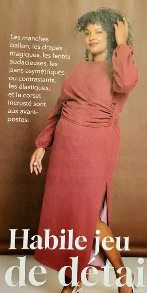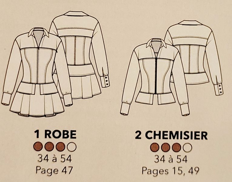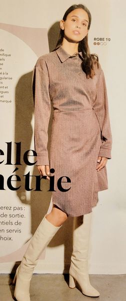 Ici, nous avons une chemise, ou une robe chemise selon la longueur que l’ont choisie. Le détail qui ajoute une plus-value à ce modèle se trouve dans le pan asymétrique. Il mériterait une réalisation avec différentes matières pour bien le mettre en valeur.