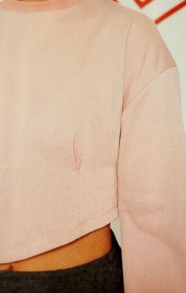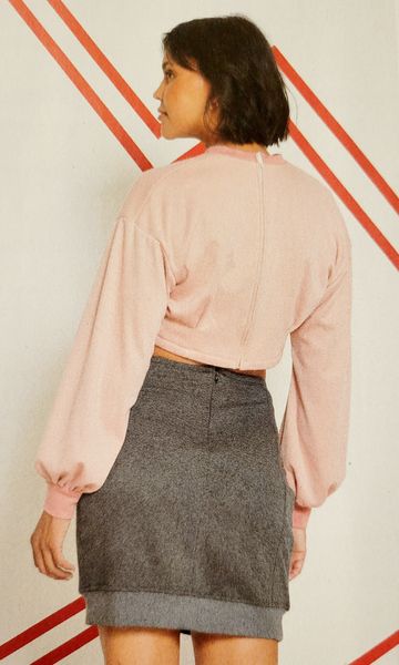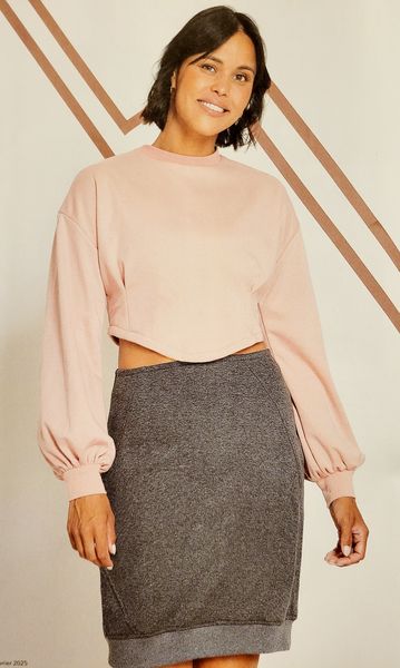 On revient sur la robe sweat et une de ses variantes. Les découpes apportent de l’originalité, ici avec la version crop sweat, la découpe nous donne un ourlet arrondi. Le contraste entre le côté court et ajusté du buste avec de longues manches bouffantes nous offre une des pièces essentielles du dressing.