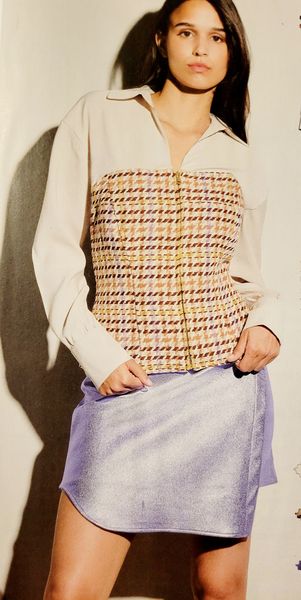 Une chemise et un corset incrusté. Alors, j’aime beaucoup le résultat. Le bustier est baleiné afin d’avoir un minimum de tenue. Le chemisier est ajusté avec une basque plus ou moins longue sous la taille. C’est tendance surtout sur une chemise blanche avec des manches longues. C’est aussi très années 2000, qui reviennent dans la mode. J’ai souvenir d’un chemisier blanc de chez kiabi avec un bustier incrusté noir, sans baleine.