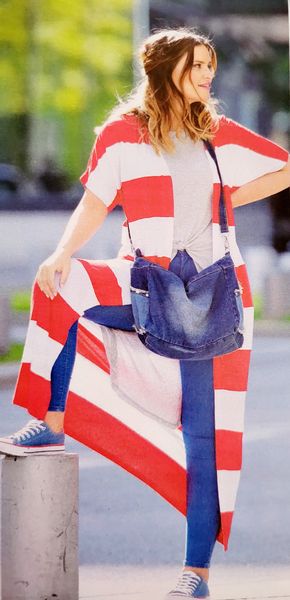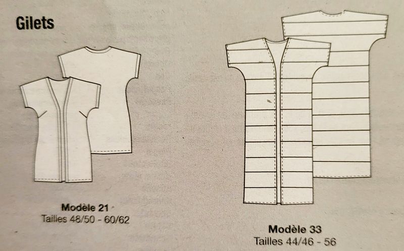 Cette version de gilet est cousue dans deux tissus différents pour avoir un effet de rayures. À nous de choisir la longueur, et surtout de jouer avec les couleurs.