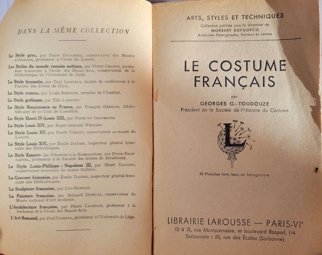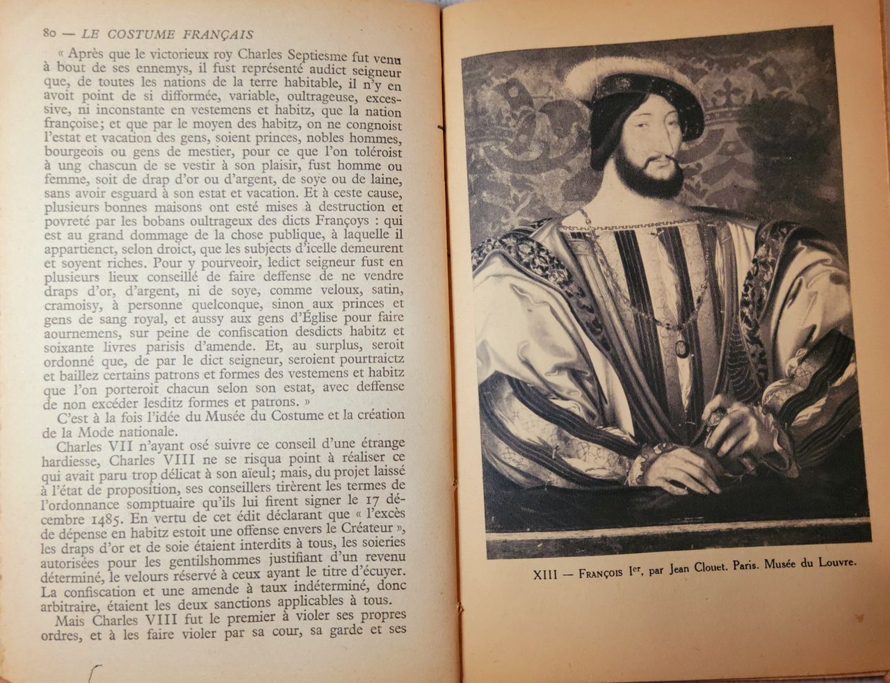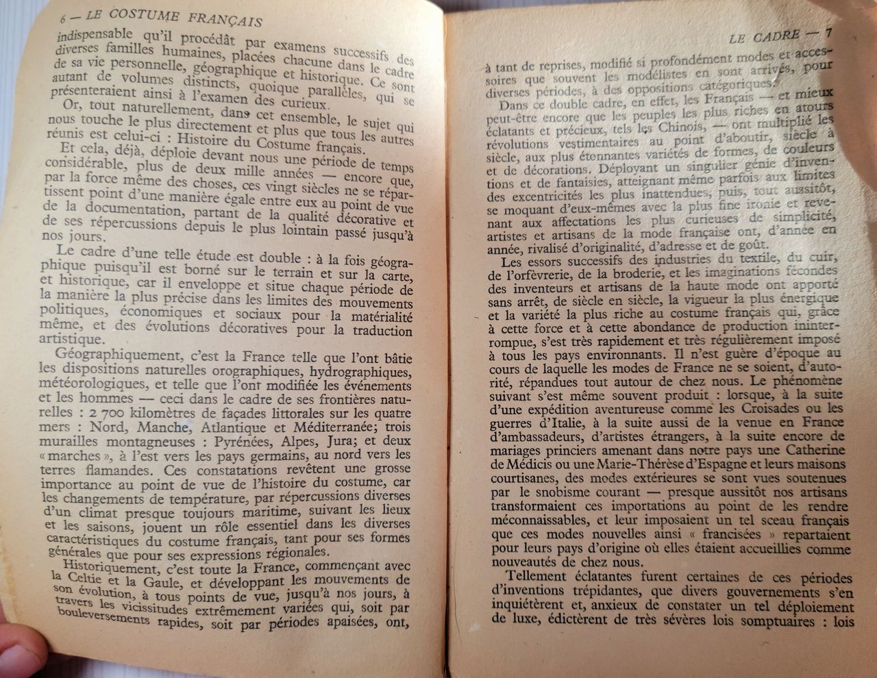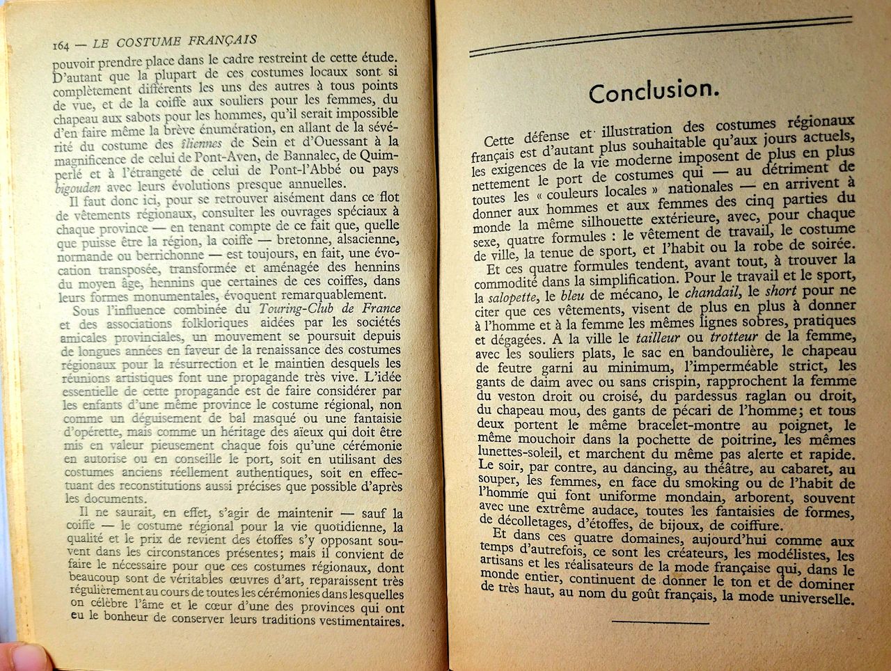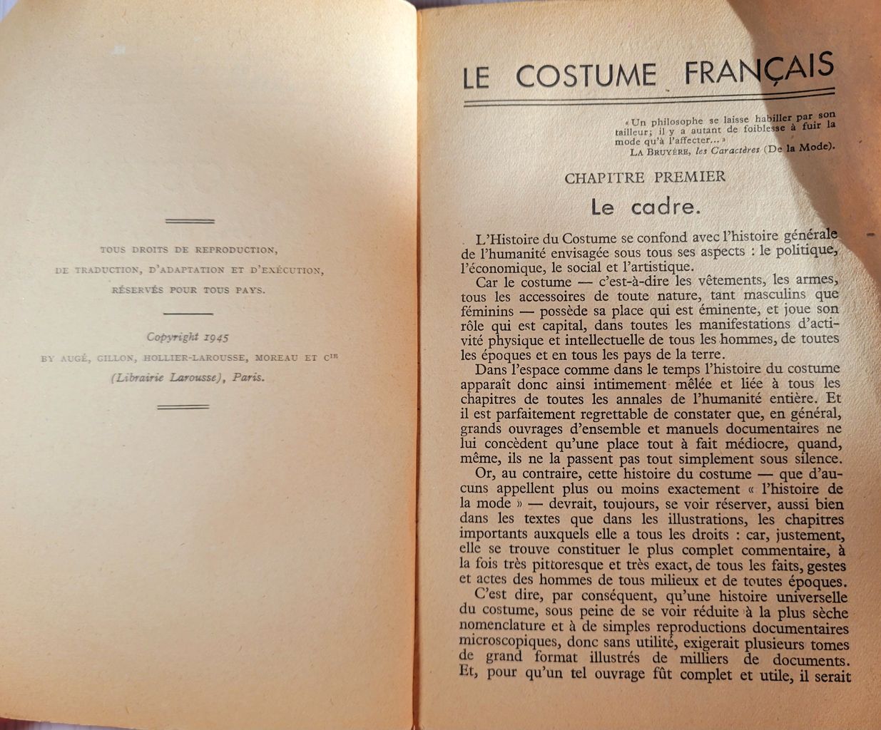 Ce livre intitulé le Costume français va à l’essentiel avec 160 pages de texte et d’illustrations. Le vêtement porté a toujours été influencé par le niveau social, la politique, mais aussi les maladies et le régionalisme. Les différents événements de l’histoire de France ont façonné la mode masculine, mais aussi féminine. Elle rayonna ensuite partout dans les pays voisins avec quelques adaptations.