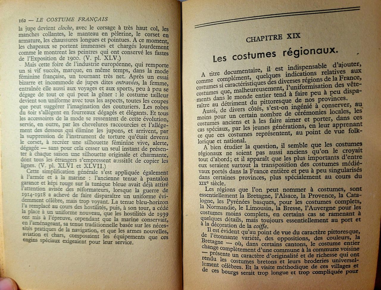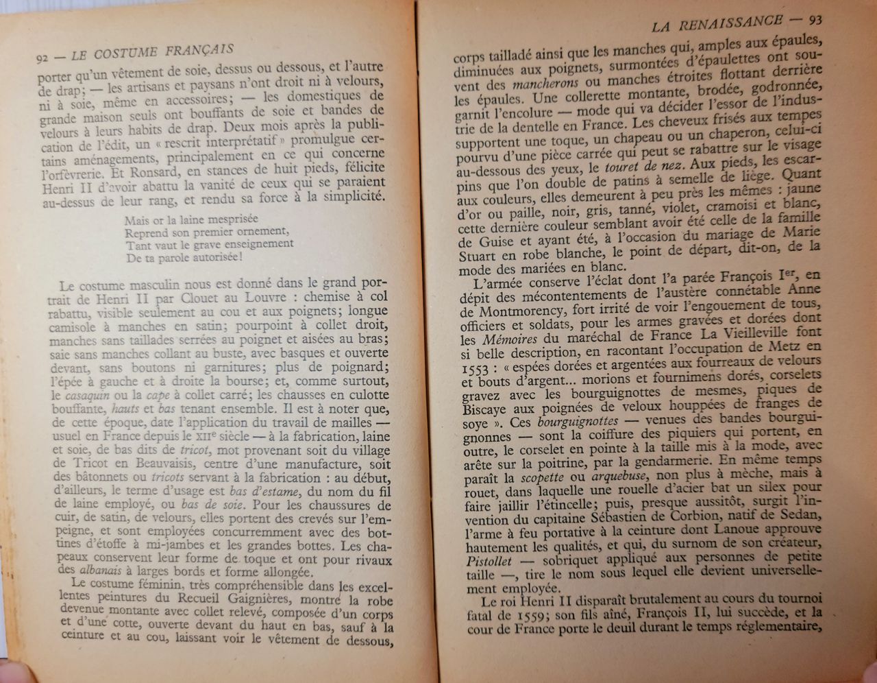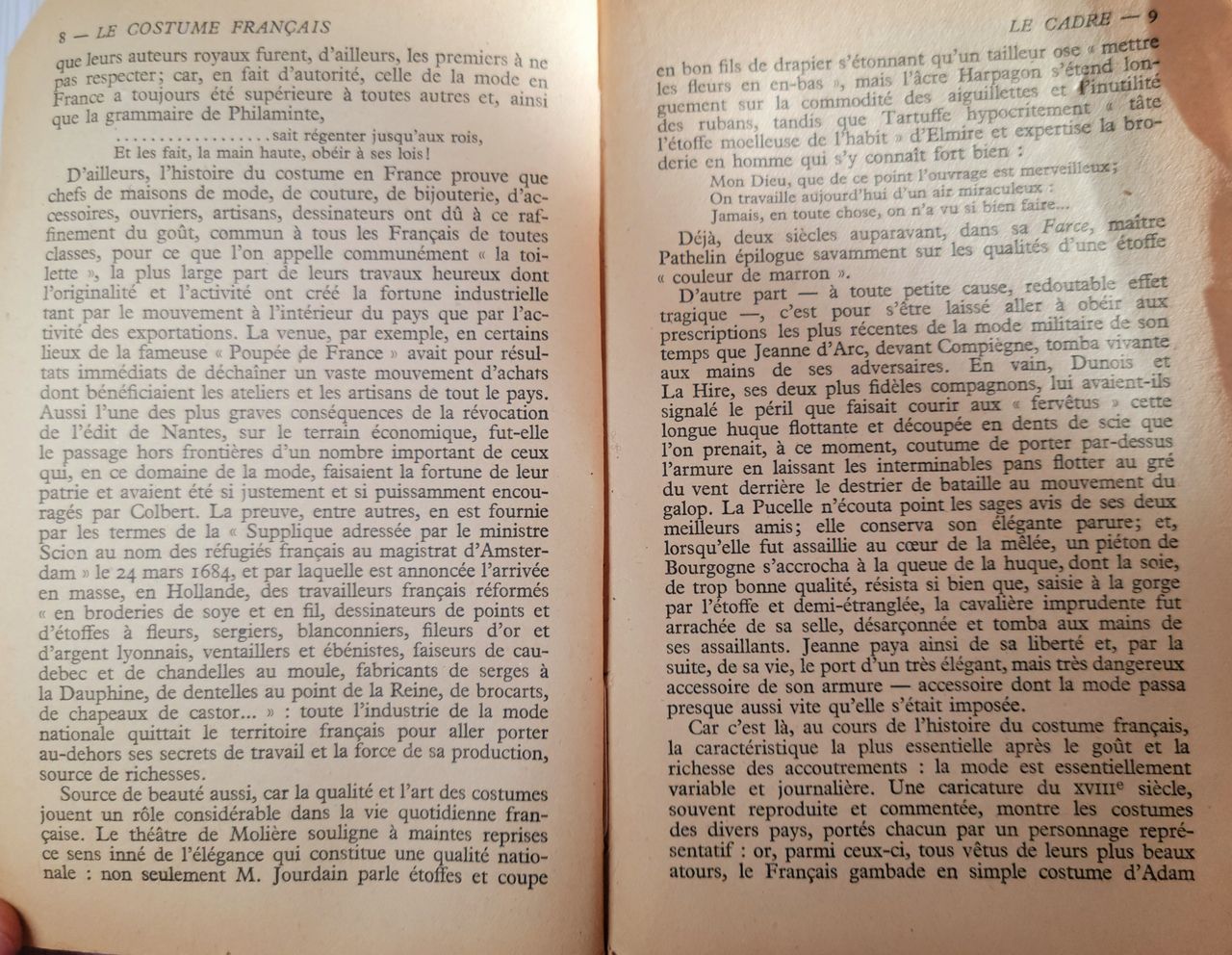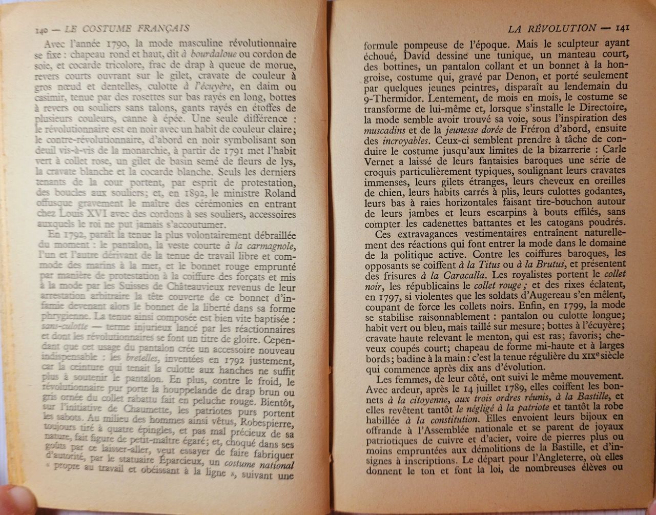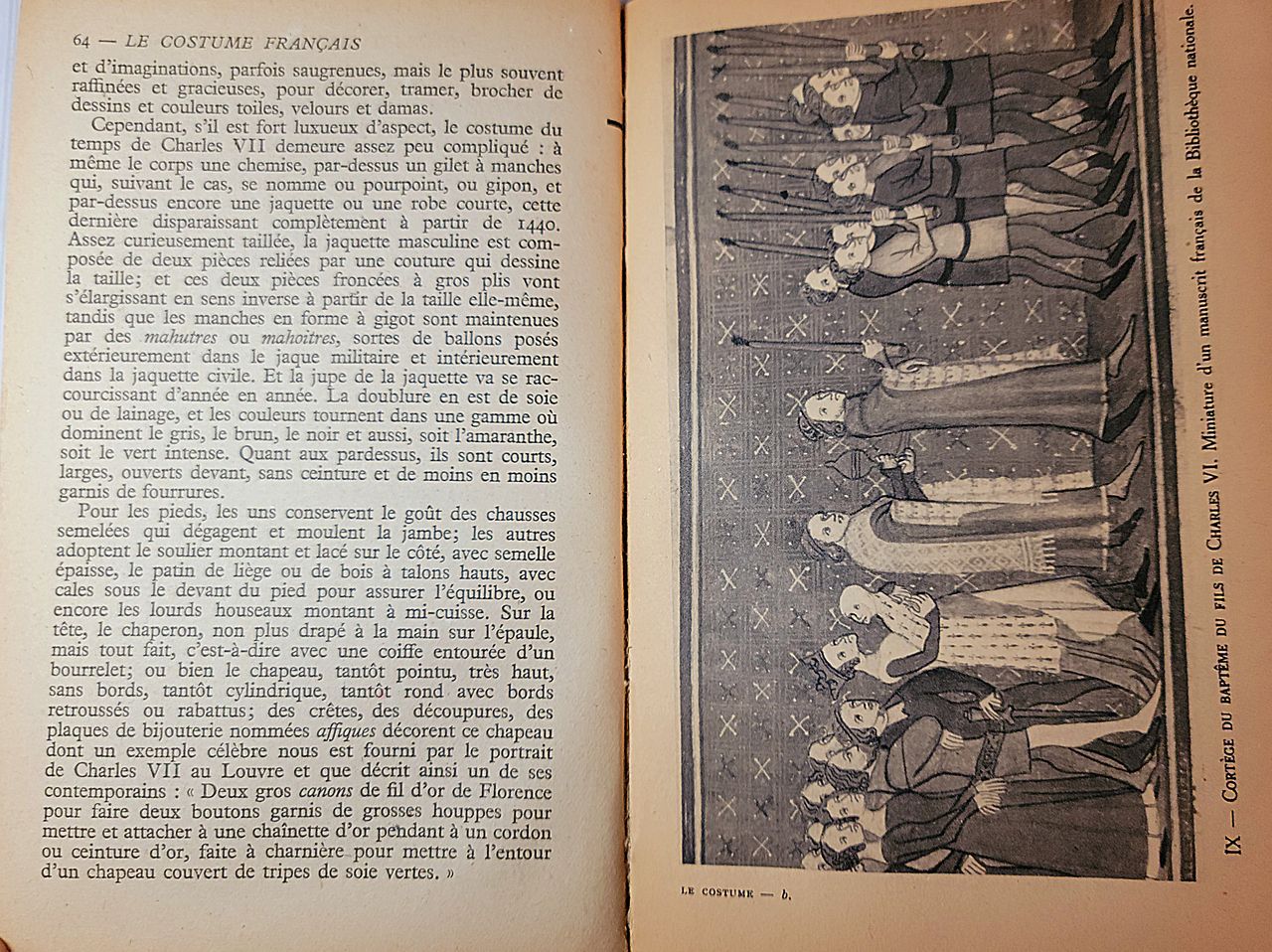 Ce livre intitulé le Costume français va à l’essentiel avec 160 pages de texte et d’illustrations. Le vêtement porté a toujours été influencé par le niveau social, la politique, mais aussi les maladies et le régionalisme. Les différents événements de l’histoire de France ont façonné la mode masculine, mais aussi féminine. Elle rayonna ensuite partout dans les pays voisins avec quelques adaptations.