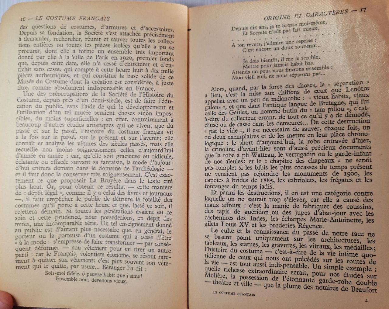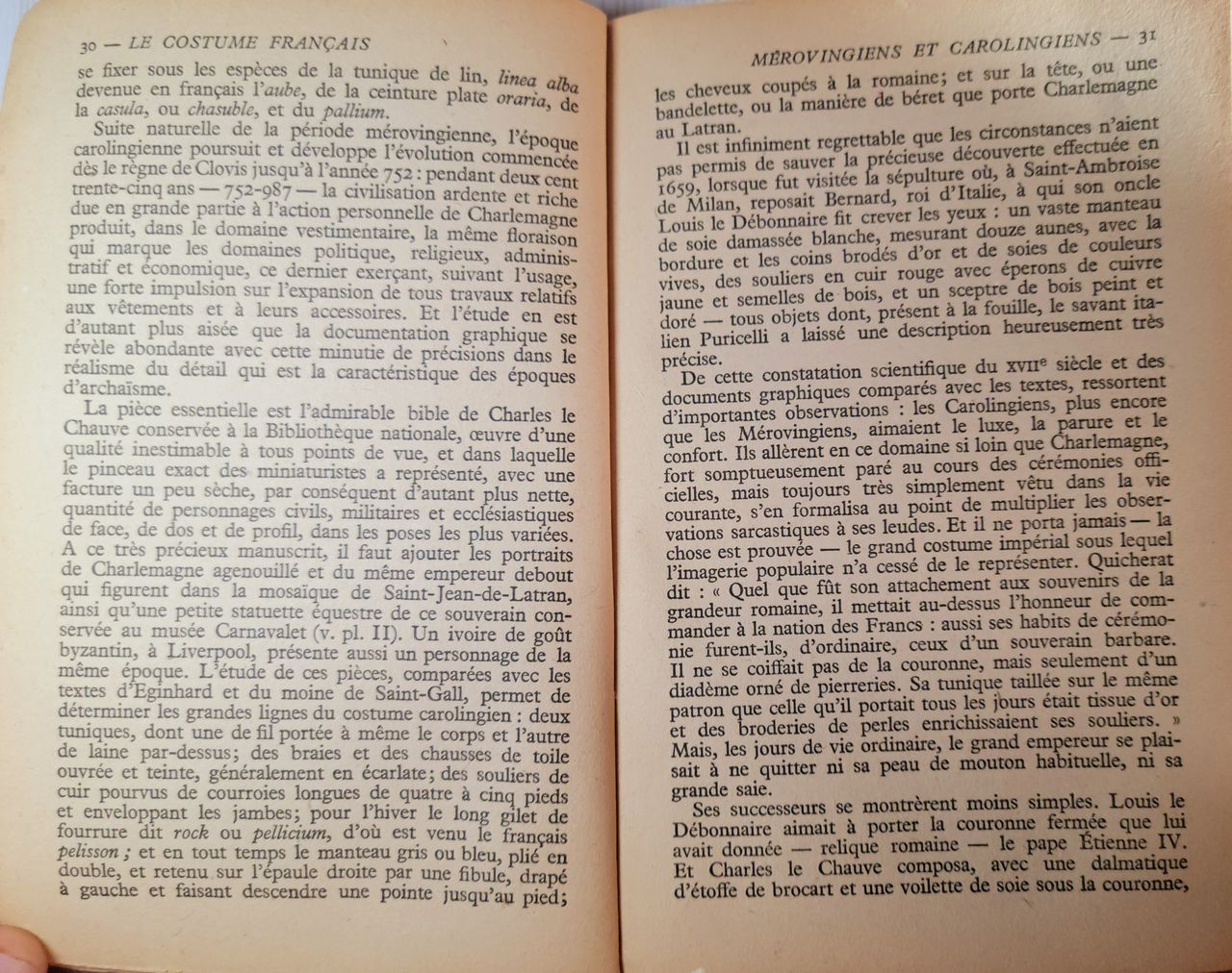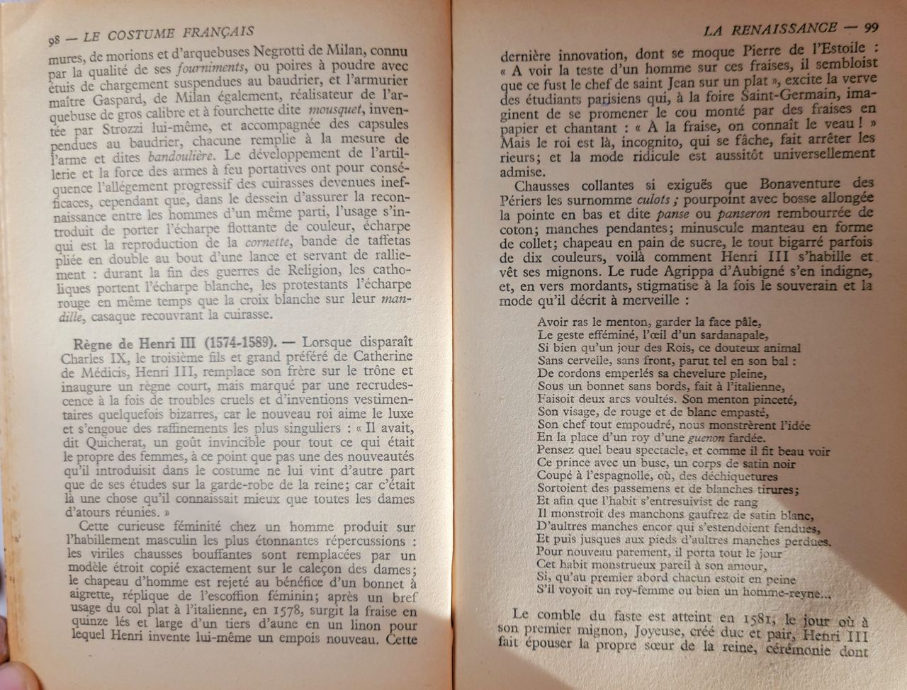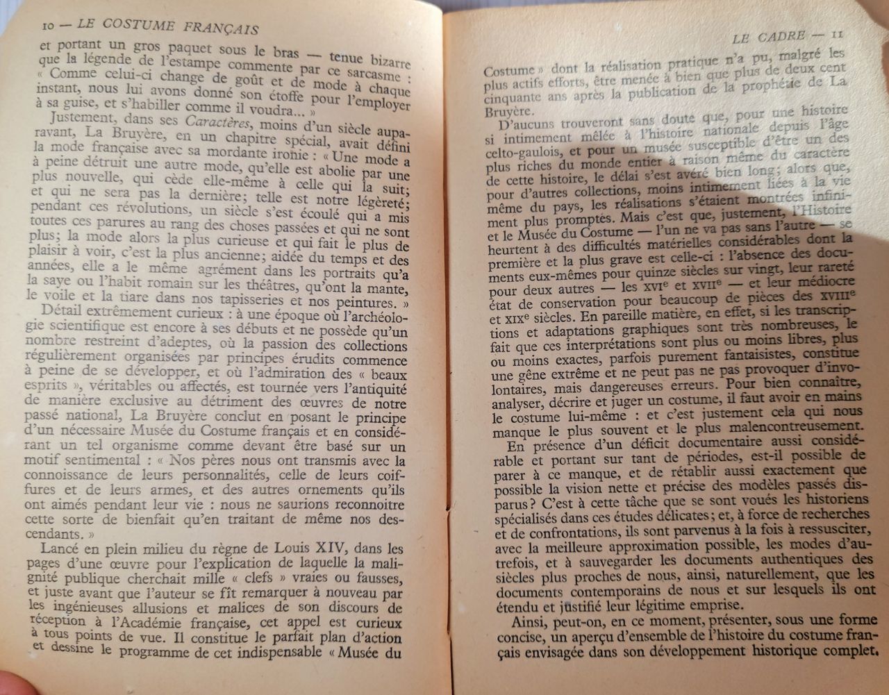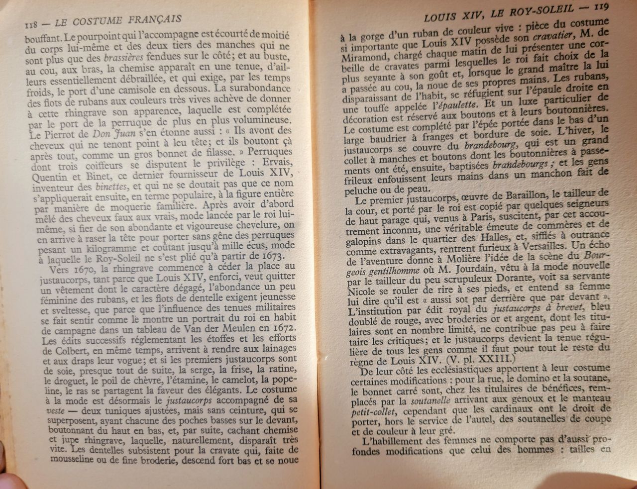 Ce livre intitulé le Costume français va à l’essentiel avec 160 pages de texte et d’illustrations. Le vêtement porté a toujours été influencé par le niveau social, la politique, mais aussi les maladies et le régionalisme. Les différents événements de l’histoire de France ont façonné la mode masculine, mais aussi féminine. Elle rayonna ensuite partout dans les pays voisins avec quelques adaptations.