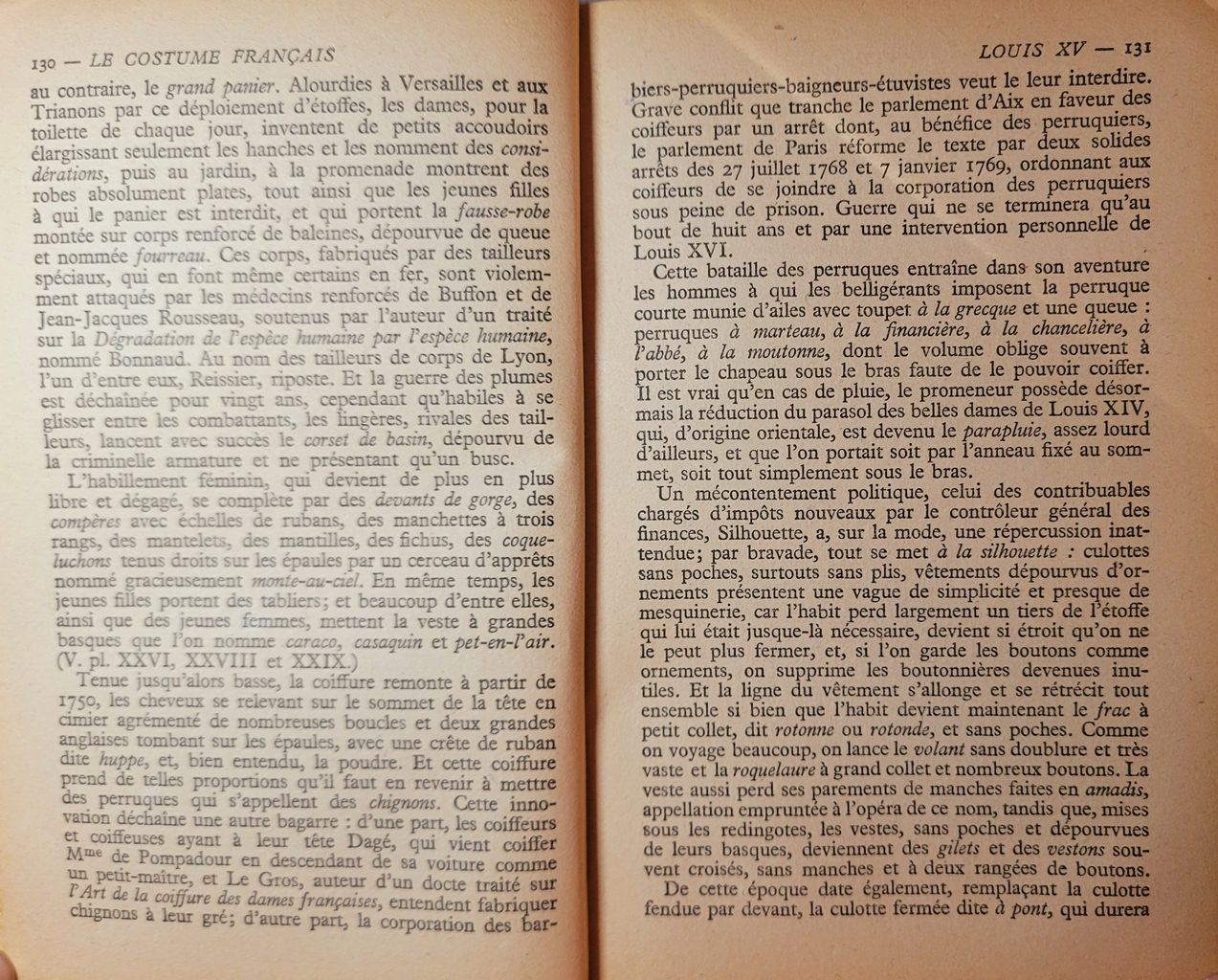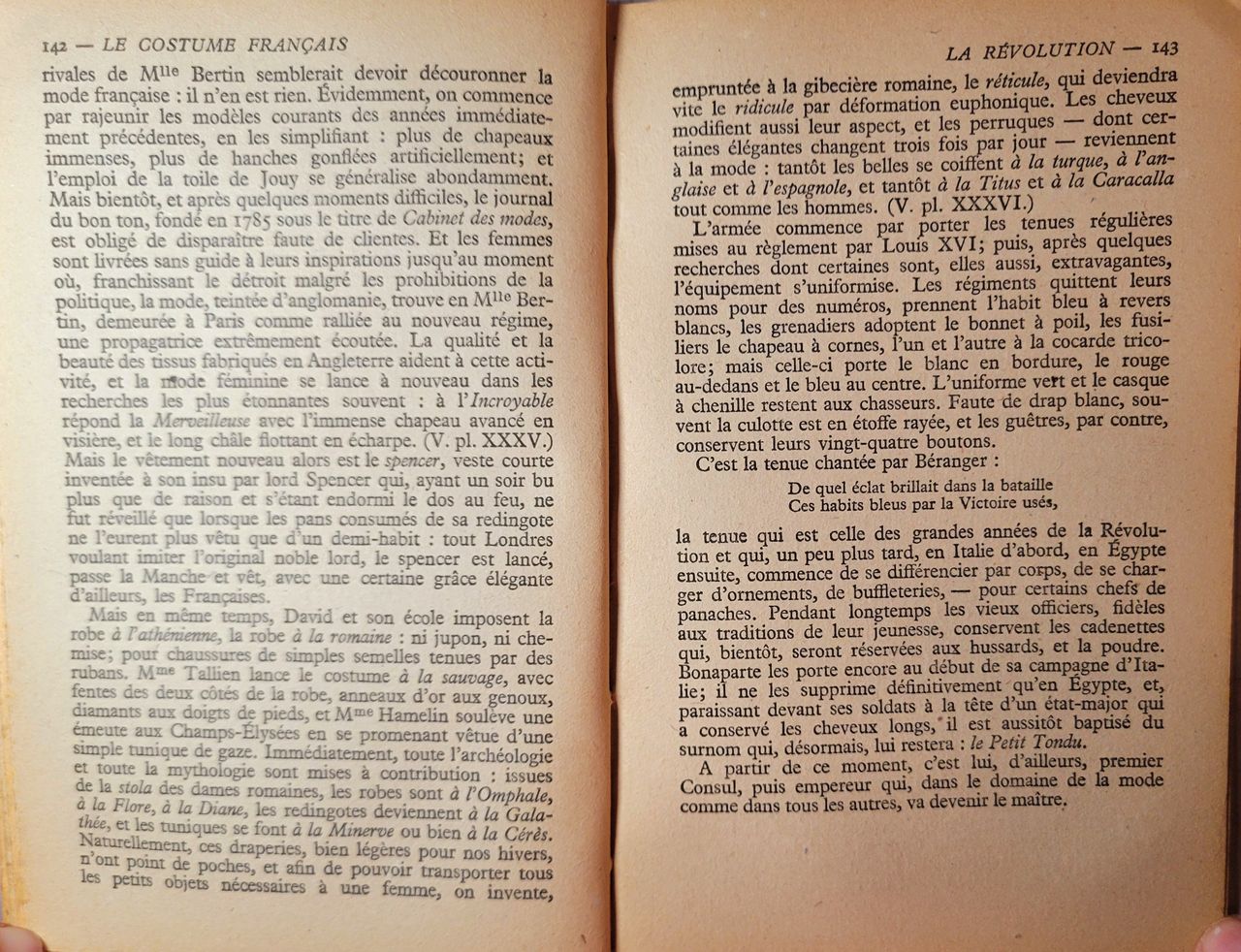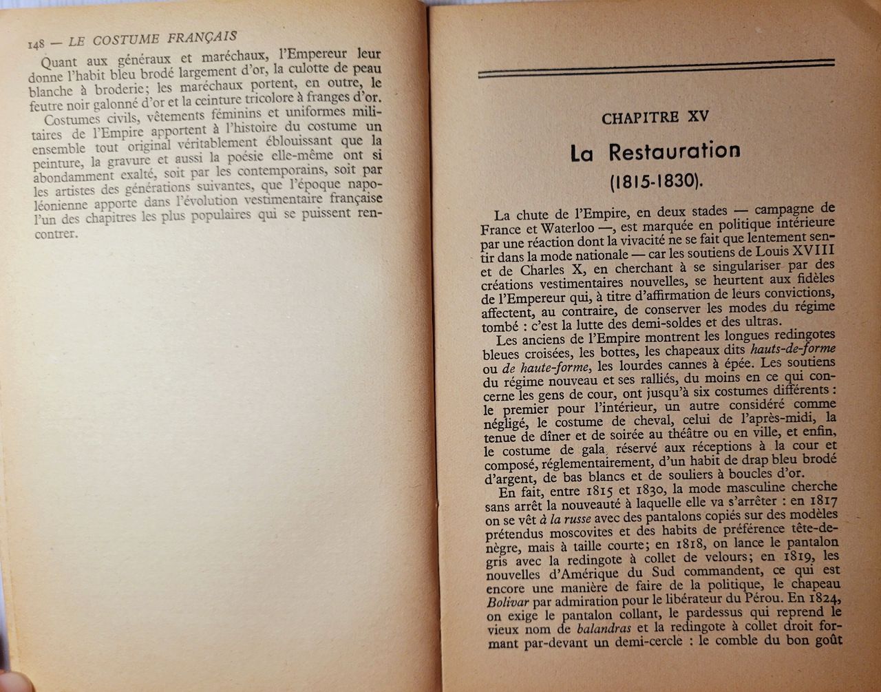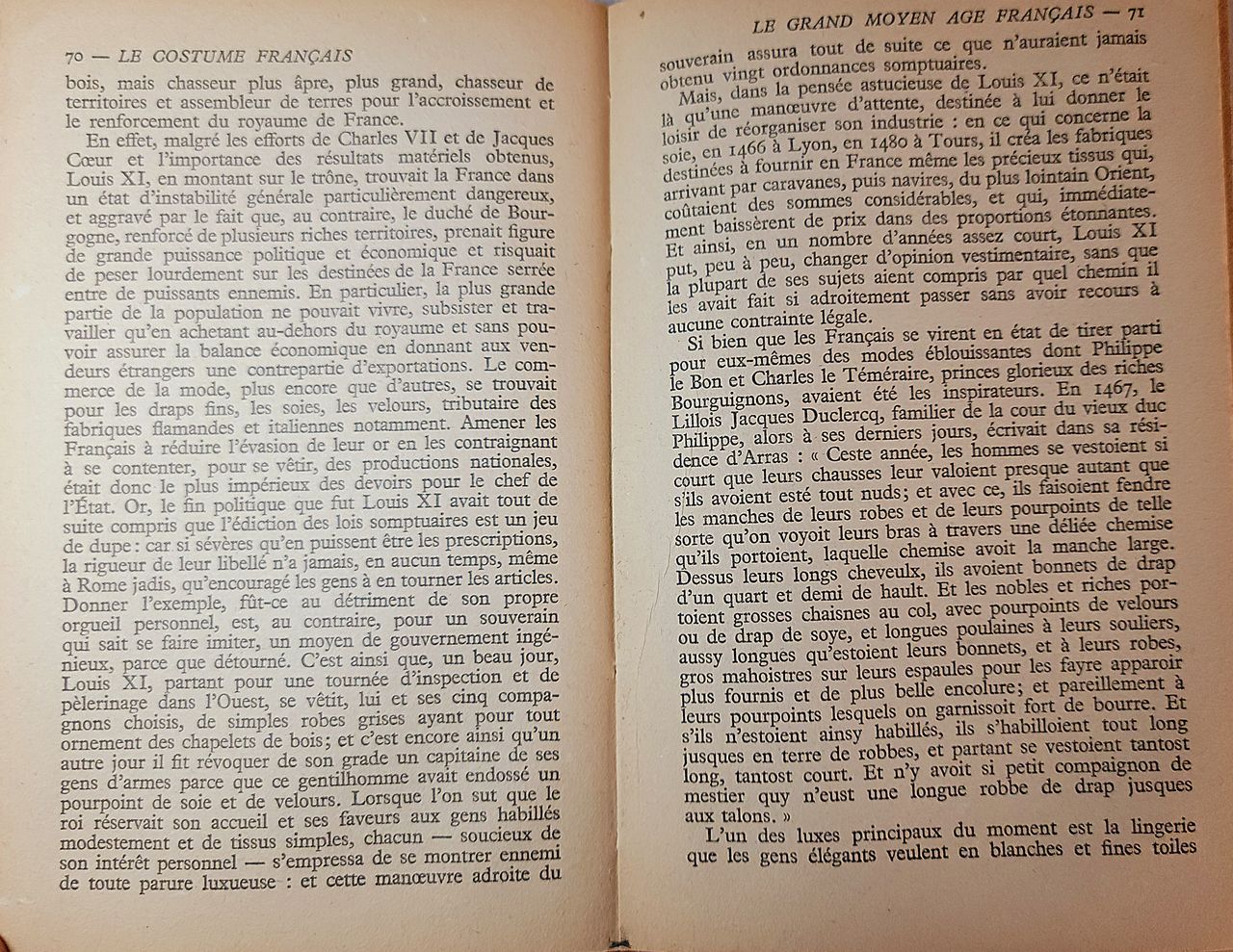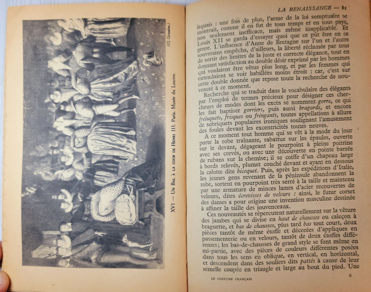 Ce livre intitulé le Costume français va à l’essentiel avec 160 pages de texte et d’illustrations. Le vêtement porté a toujours été influencé par le niveau social, la politique, mais aussi les maladies et le régionalisme. Les différents événements de l’histoire de France ont façonné la mode masculine, mais aussi féminine. Elle rayonna ensuite partout dans les pays voisins avec quelques adaptations.