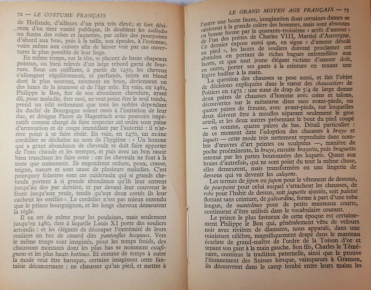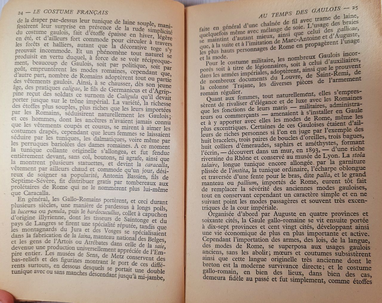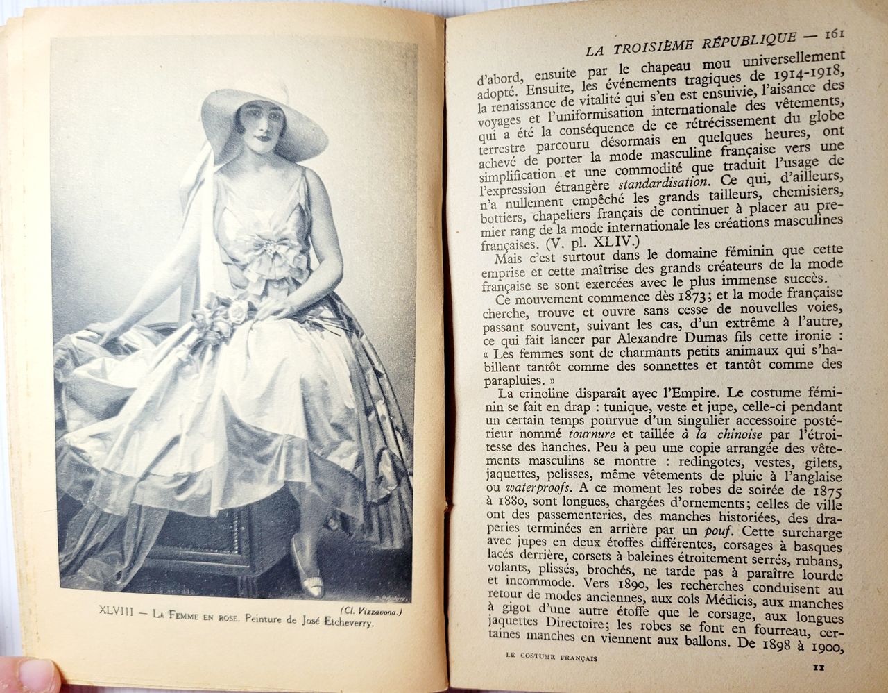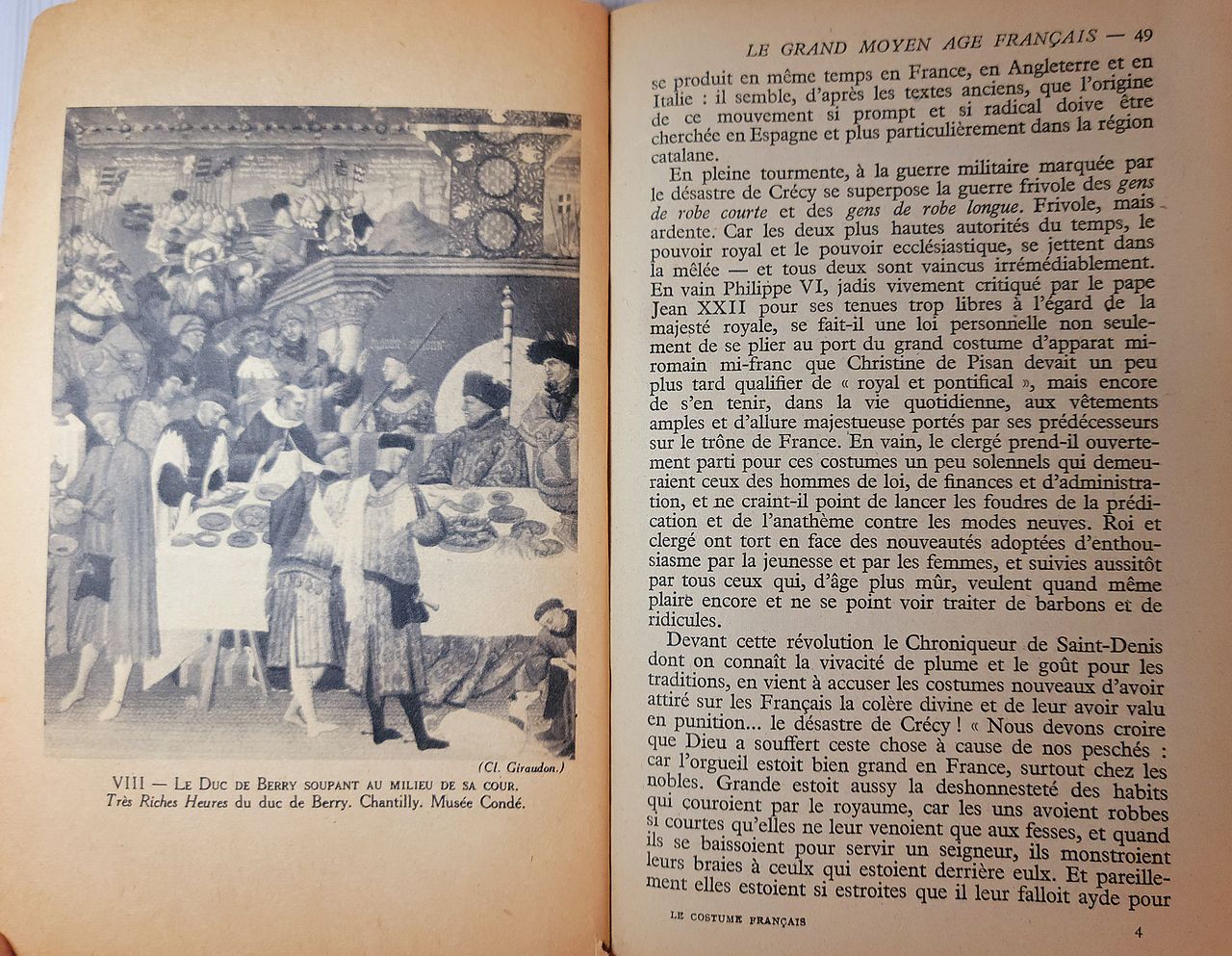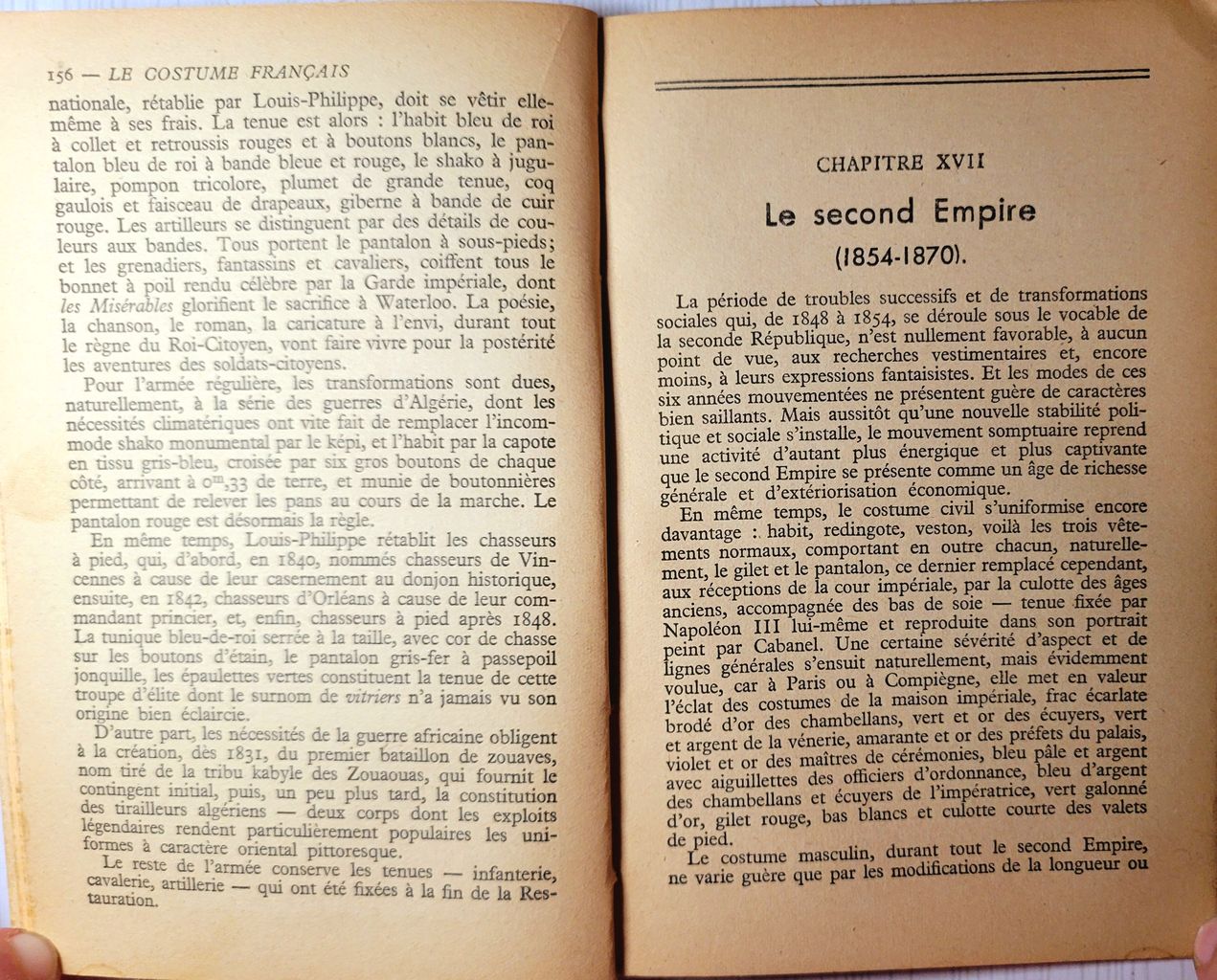 Ce livre intitulé le Costume français va à l’essentiel avec 160 pages de texte et d’illustrations. Le vêtement porté a toujours été influencé par le niveau social, la politique, mais aussi les maladies et le régionalisme. Les différents événements de l’histoire de France ont façonné la mode masculine, mais aussi féminine. Elle rayonna ensuite partout dans les pays voisins avec quelques adaptations.