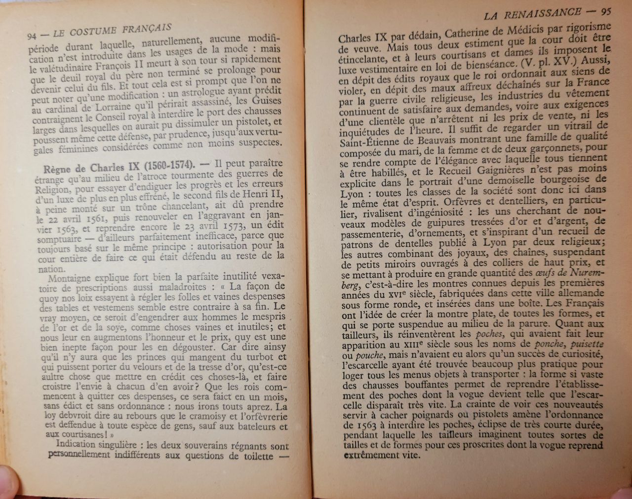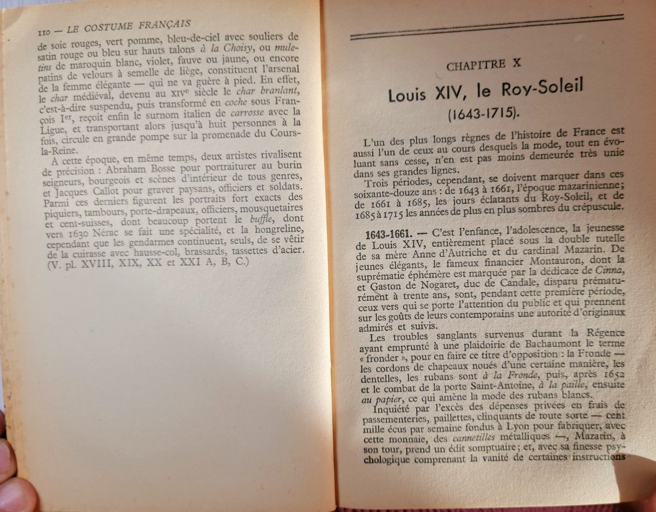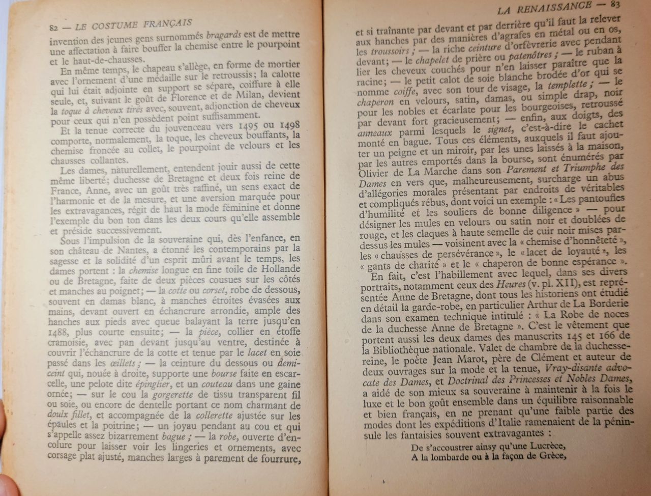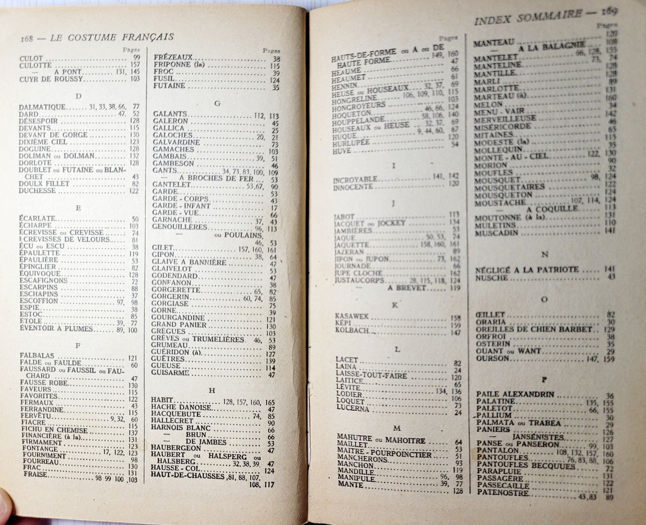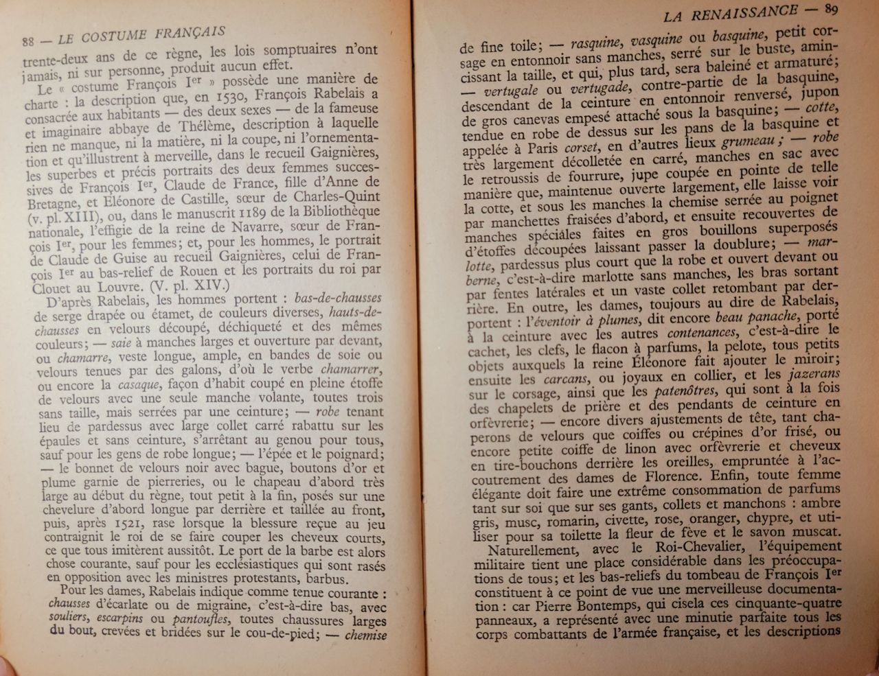 Ce livre intitulé le Costume français va à l’essentiel avec 160 pages de texte et d’illustrations. Le vêtement porté a toujours été influencé par le niveau social, la politique, mais aussi les maladies et le régionalisme. Les différents événements de l’histoire de France ont façonné la mode masculine, mais aussi féminine. Elle rayonna ensuite partout dans les pays voisins avec quelques adaptations.