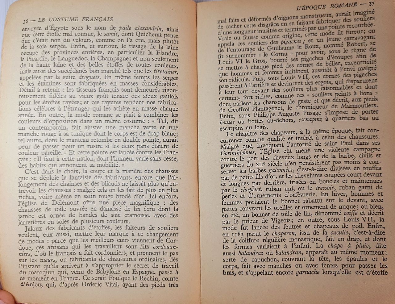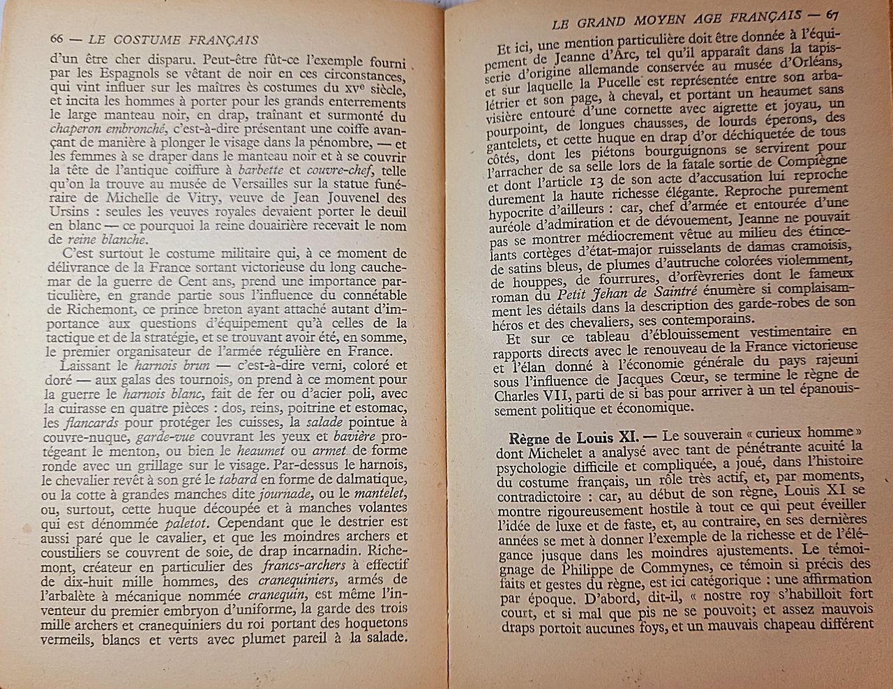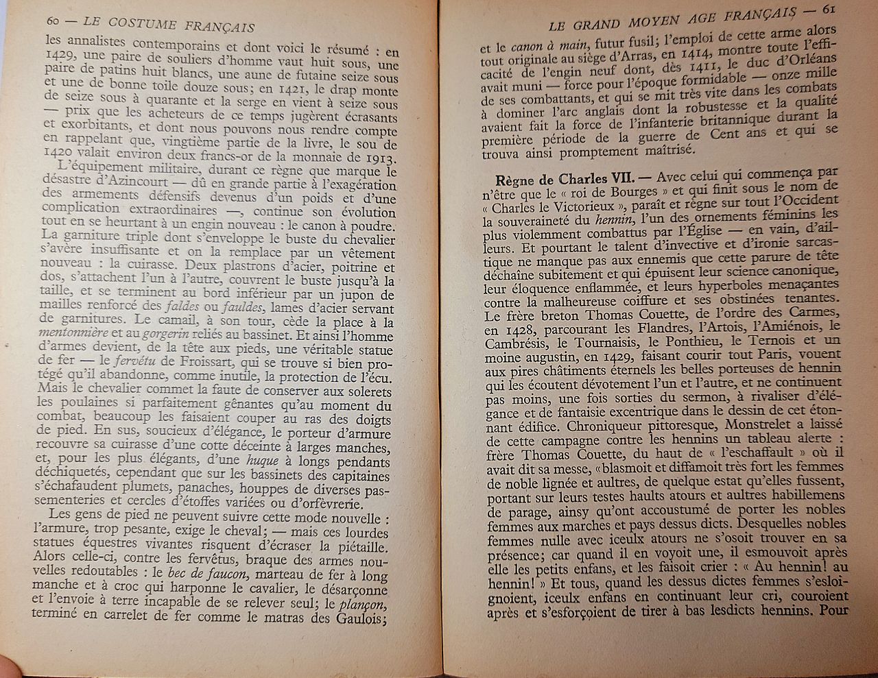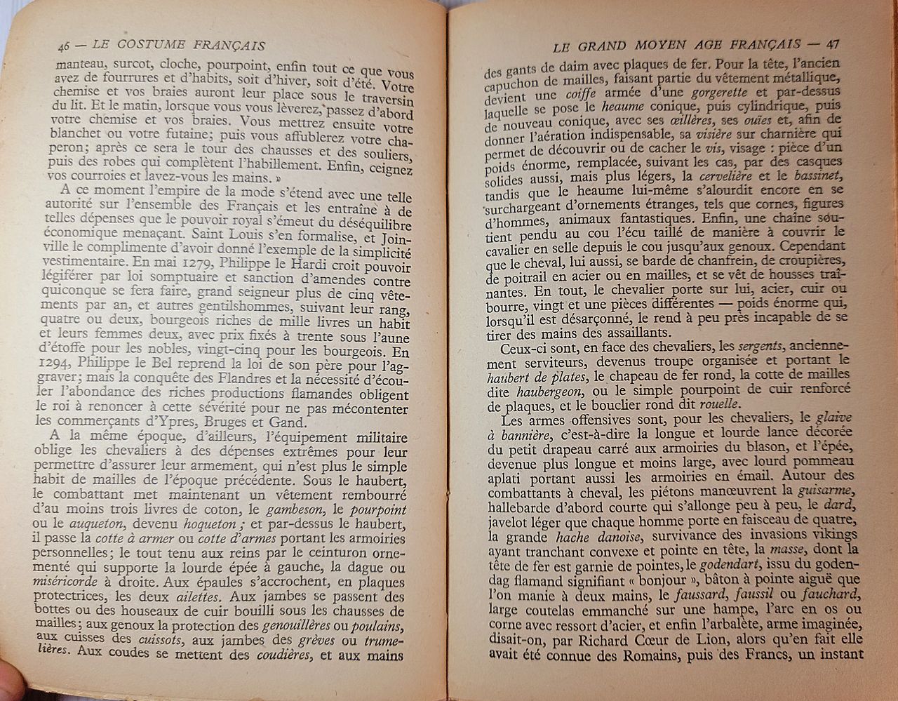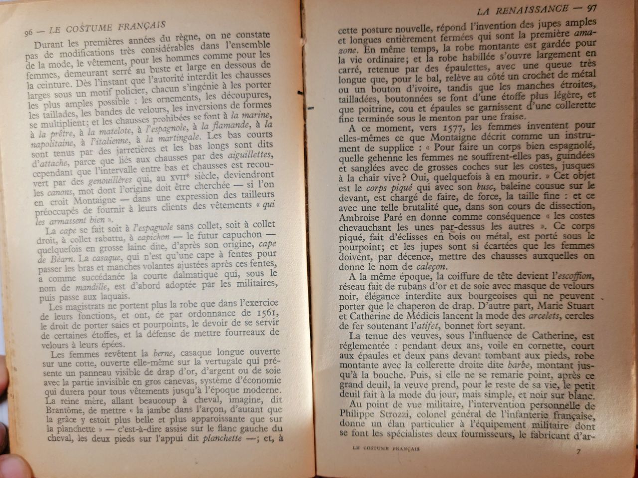 Ce livre intitulé le Costume français va à l’essentiel avec 160 pages de texte et d’illustrations. Le vêtement porté a toujours été influencé par le niveau social, la politique, mais aussi les maladies et le régionalisme. Les différents événements de l’histoire de France ont façonné la mode masculine, mais aussi féminine. Elle rayonna ensuite partout dans les pays voisins avec quelques adaptations.