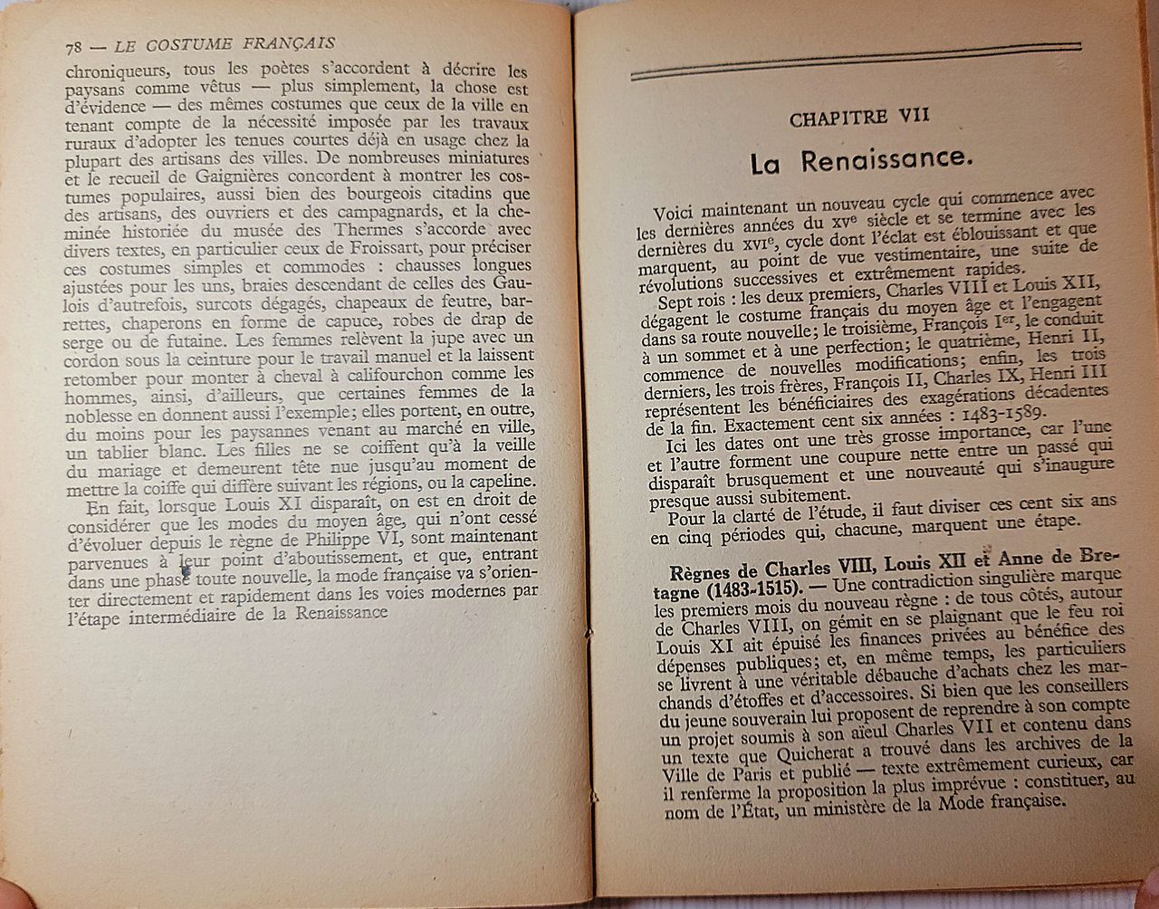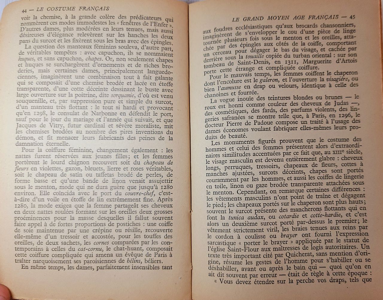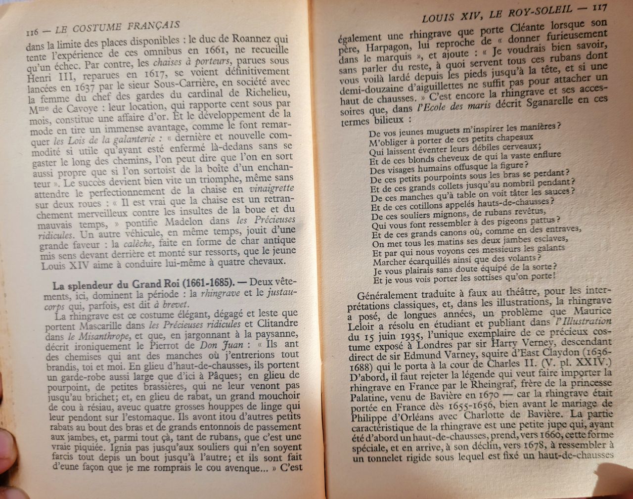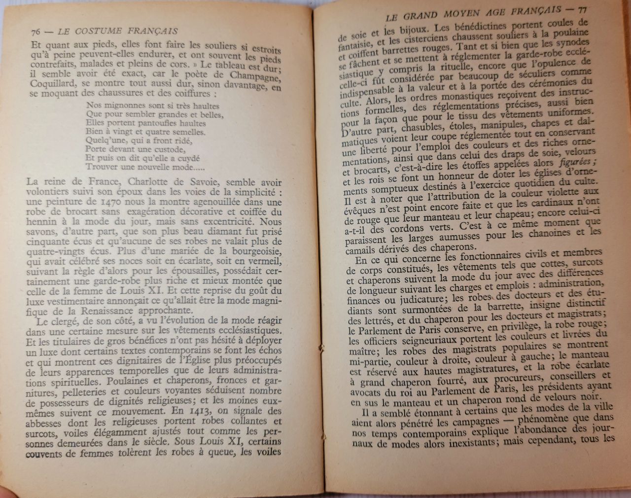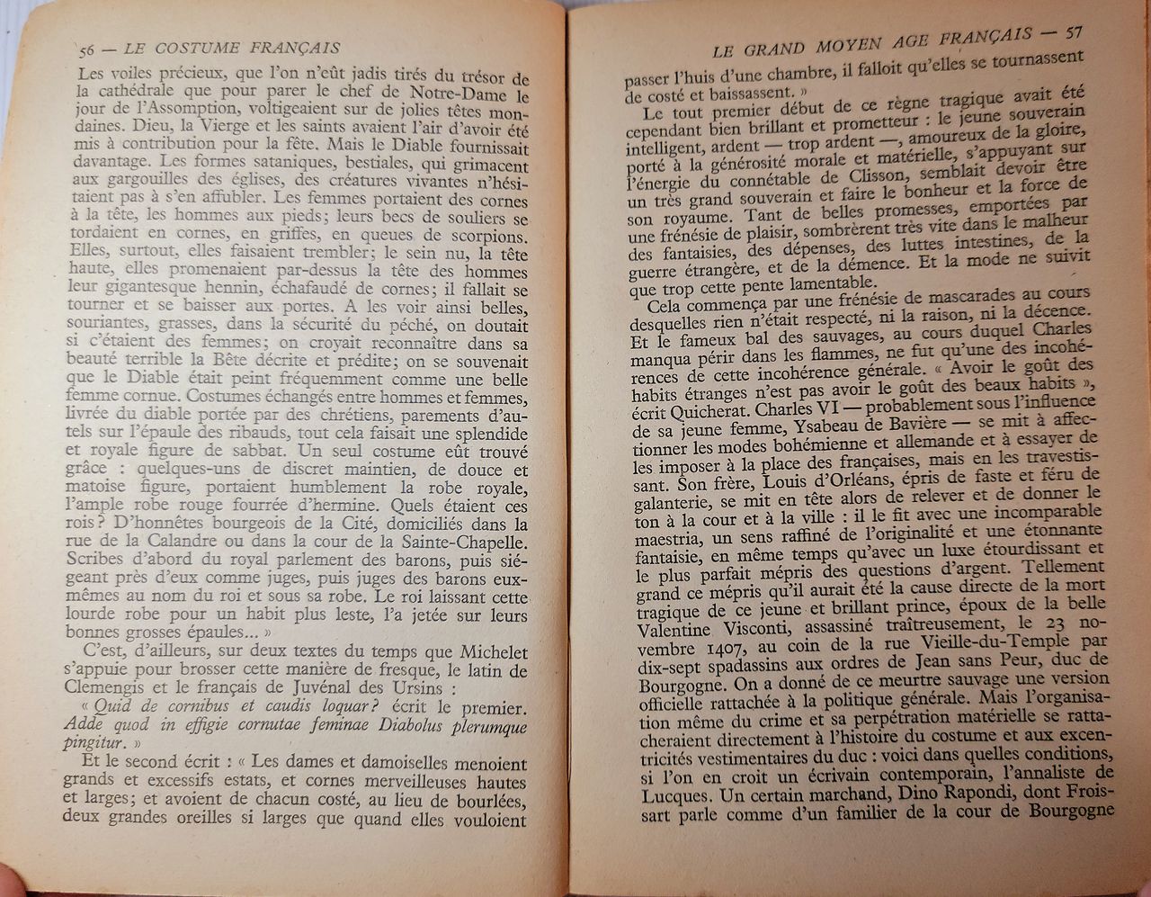 Ce livre intitulé le Costume français va à l’essentiel avec 160 pages de texte et d’illustrations. Le vêtement porté a toujours été influencé par le niveau social, la politique, mais aussi les maladies et le régionalisme. Les différents événements de l’histoire de France ont façonné la mode masculine, mais aussi féminine. Elle rayonna ensuite partout dans les pays voisins avec quelques adaptations.