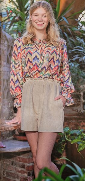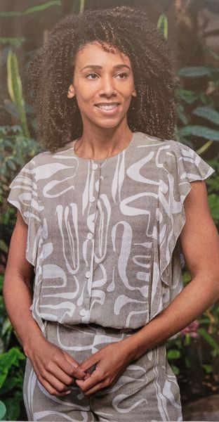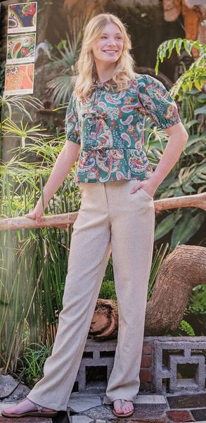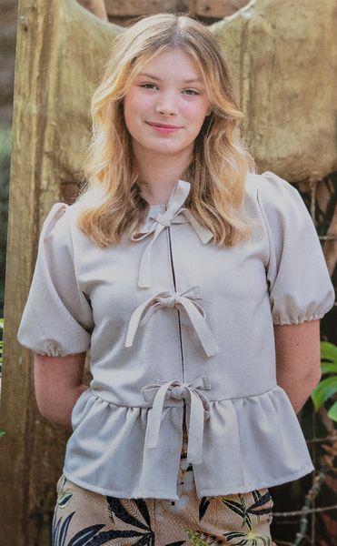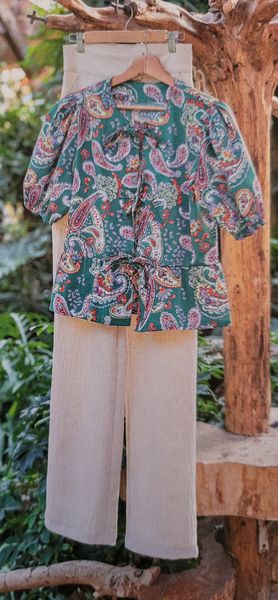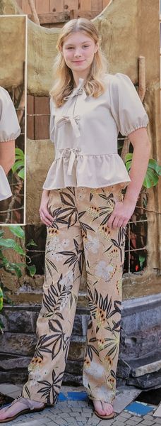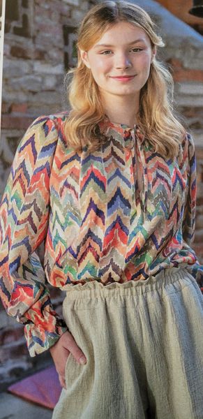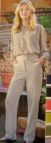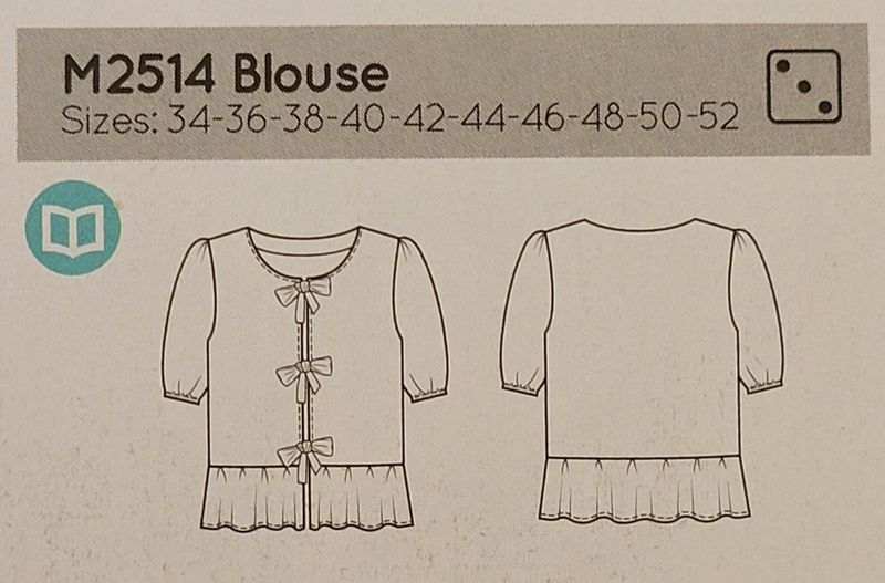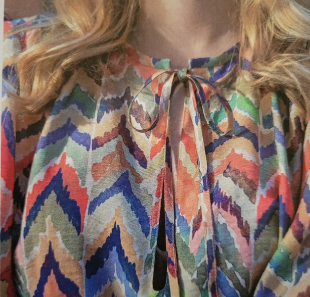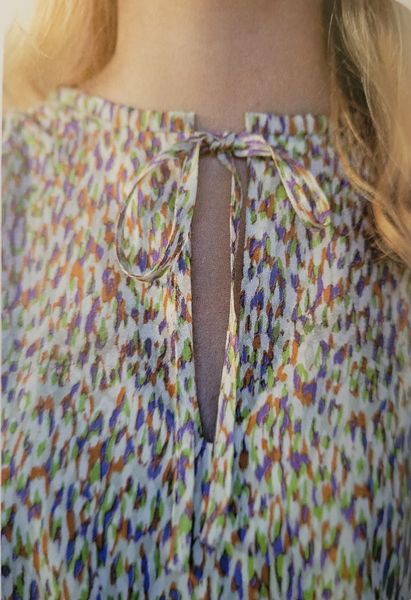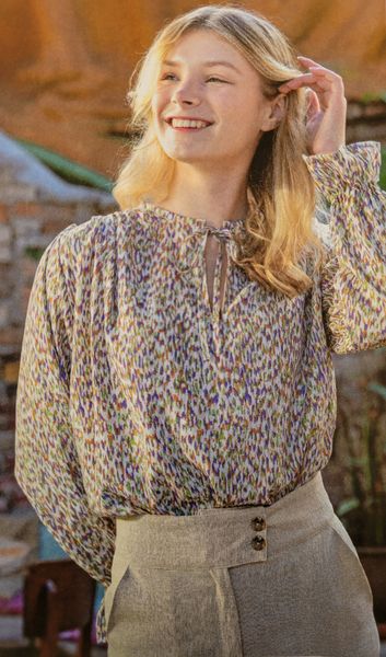 J’aime la forme de cette blouse. Elle me fait penser aux années 40 avec ses manches ballons et sa petite basque. L’encolure est ronde. Pour la fermer, notez la présence de rubans à nouer.
