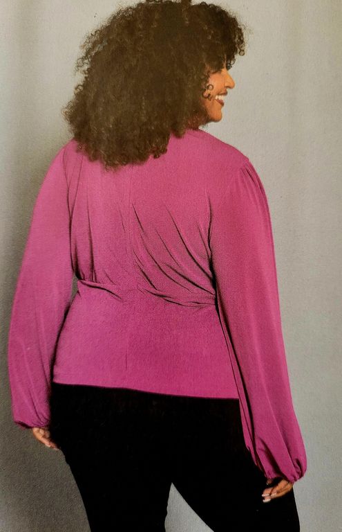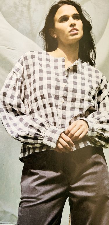 Voici une jolie blouse avec une couture incurvée sous la poitrine. Les manches longues sont bouffantes et resserrées au poignet.