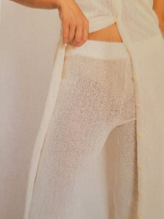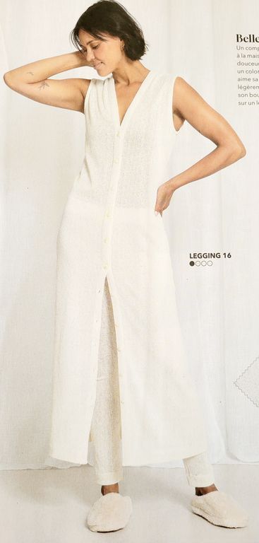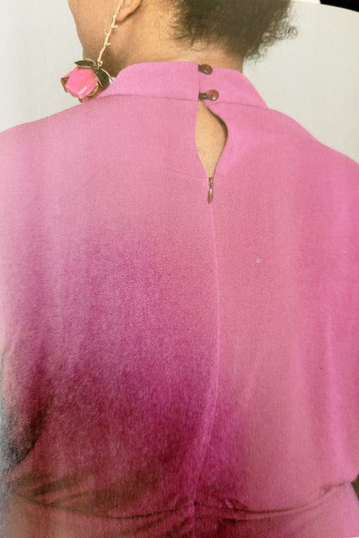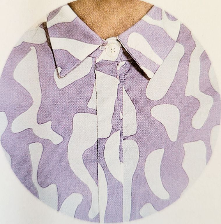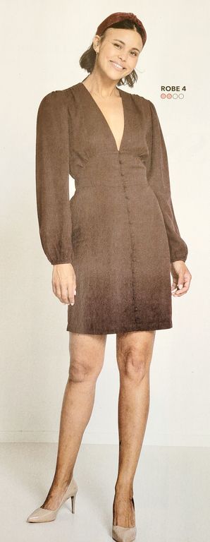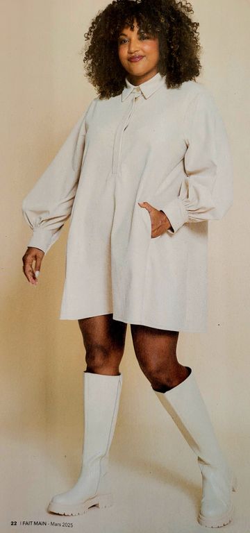 On reste dans la variante de la blouse ci-dessus, mais en version robe boutonnée. La jupe est droite, la taille ici est soulignée par un large empiècement.