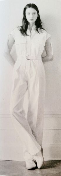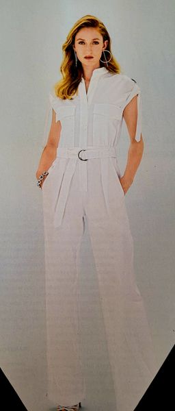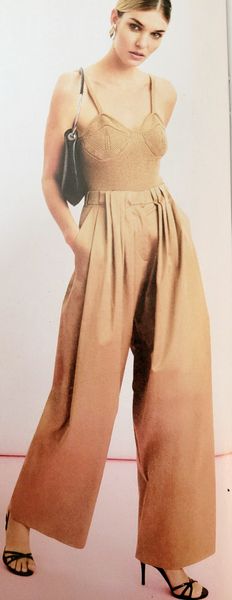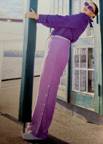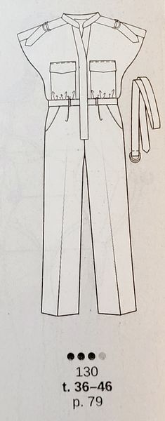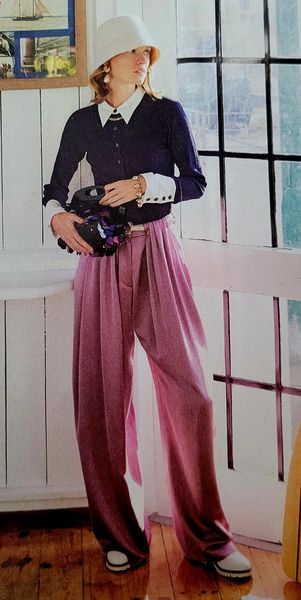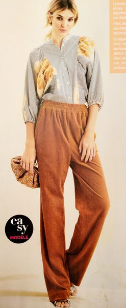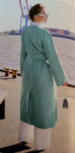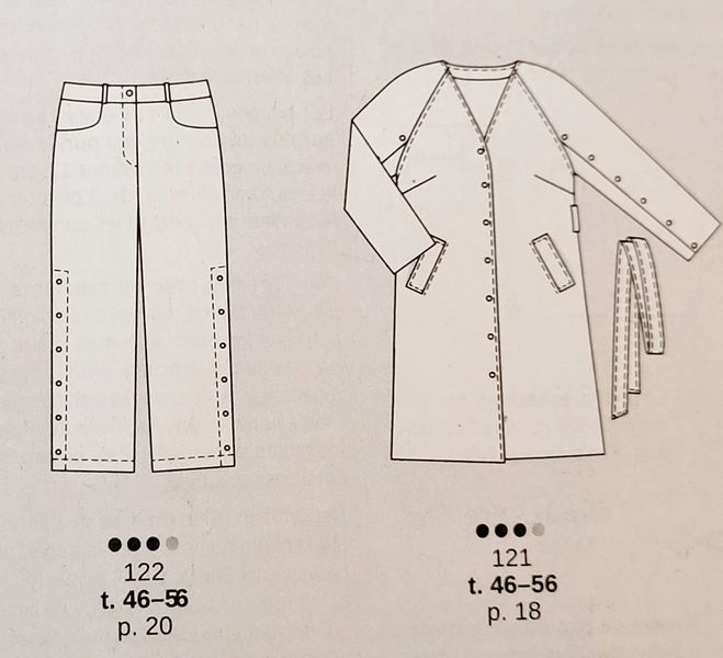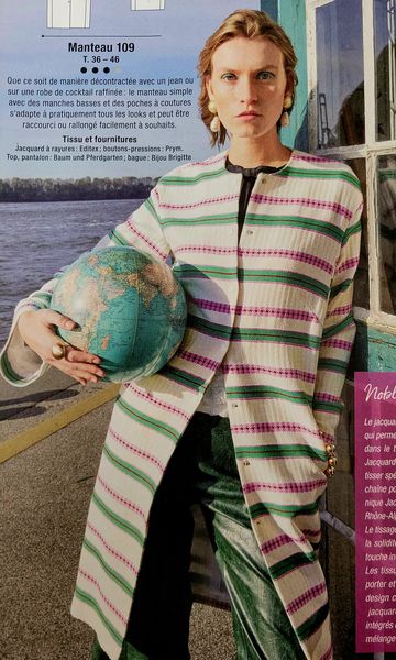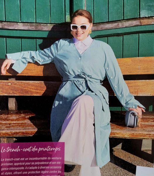 Ici cette pièce est qualifiée de trench-coat. Là, je ne suis pas d’accord, car hormis la longueur et la fente dans le dos, nous avons plutôt un trench low cost. Mais j’aime beaucoup cette simplicité, des manches raglans, un décolleté en V, pas trop d’ampleur. Je ne suis pas fan de la série de pressions sur la manche tout comme le pantalon.