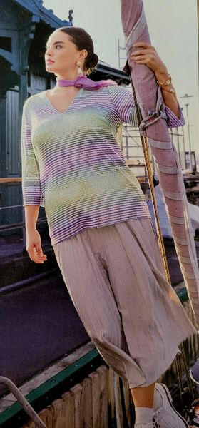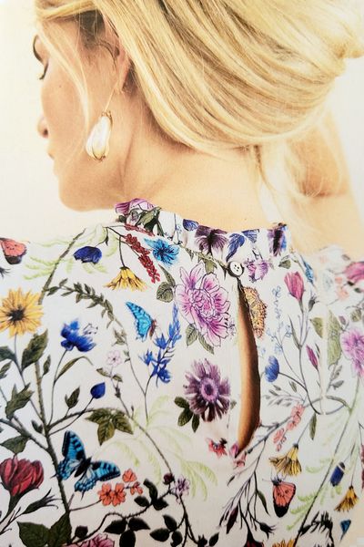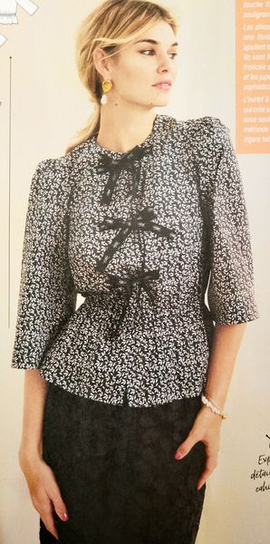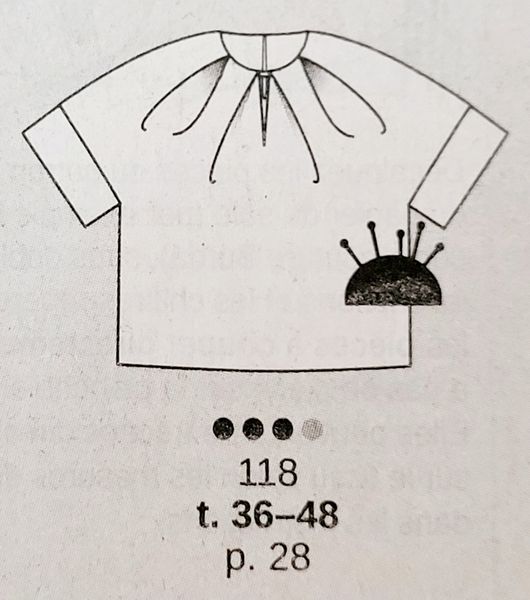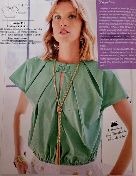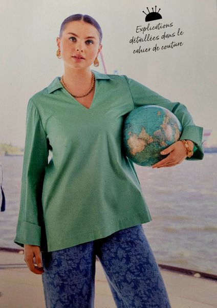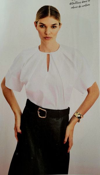 J’adore cette superbe blouse dans ses deux versions. Elle nous offre de l’ampleur, grâce à son jeu de plis creux et plat autour de l’encolure ronde qui est garnie d’une fente verticale. Elle ne possede pas de manches ou alors des petits mancherons. Le bas est proposé droit avec un ourlet basique ou un élastiqué.