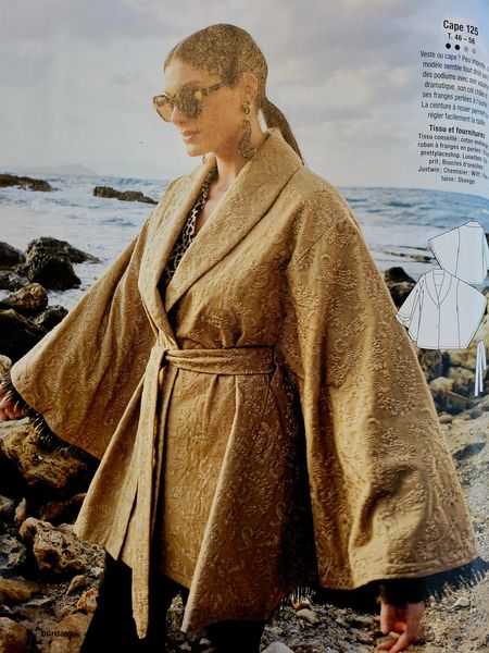 Je suis rarement fan des capes Mais celle-ci me plait beaucoup, elle est structurée à l’aide de découpes verticales. Le grand col châle apporte une touche d’élégance.