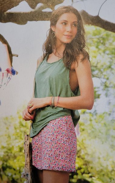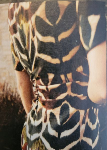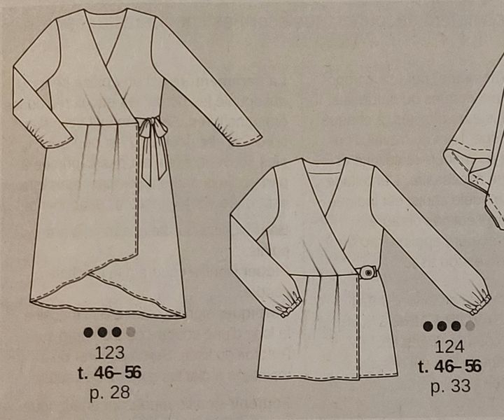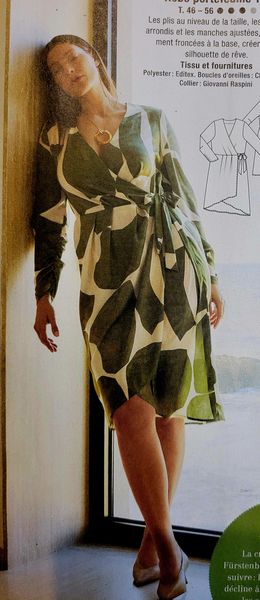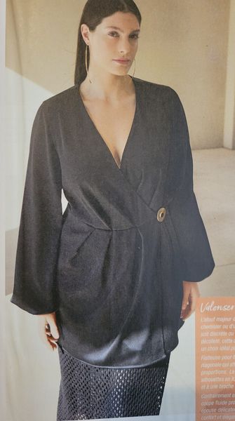 Ici aussi la qualité du tissu joue beaucoup sur le résultat final. La fluidité surtout importe particulièrement. Nous avons une jolie robe cache-cœur et croisée pour la jupe, qui est plus courte devant. Les manches sont terminées de deux façons, avec un plissage dans la couture ou un élastique sur coulisse.