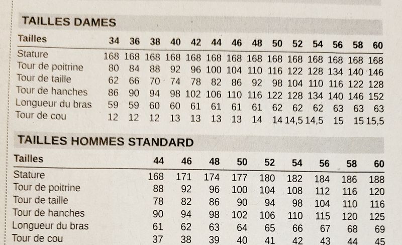 Le tableau des tailles