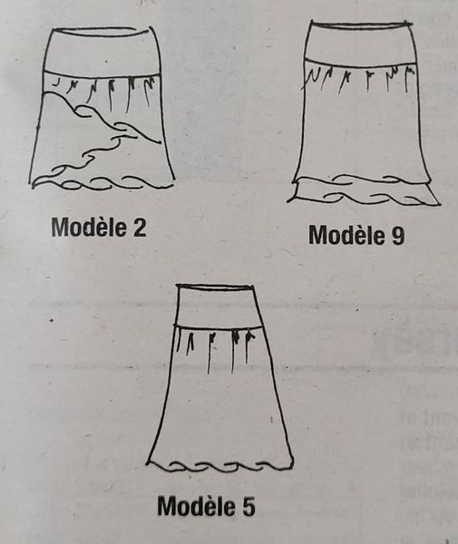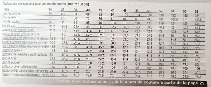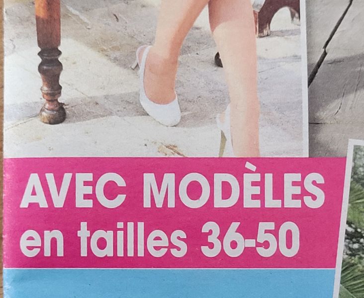 Vous trouverez dans la rubrique les modèles la liste des tailles. En effet, il n’y a pas de double-page reprenant ces variations, ainsi, j’en ai fait la liste pour vous. Sur la couverture, on apprend juste que nous trouverons des pièces en tailles 36-50.
