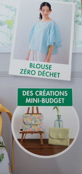 Ce qui a tout de suite capté mon attention sur la couverture, ce sont ces deux petits encarts. Avec la réalisation d’une blouse zéro déchet, qui matche parfaitement avec des créations mini-budget. Pas besoin d’avoir le dernier imprimé tendance, ou ce tissu qui coute un bras ! Non, non, en plus les bras, vous en aurez besoin pour coudre. On peut se faire plaisir à petit budget.