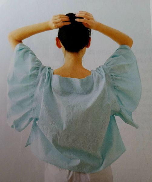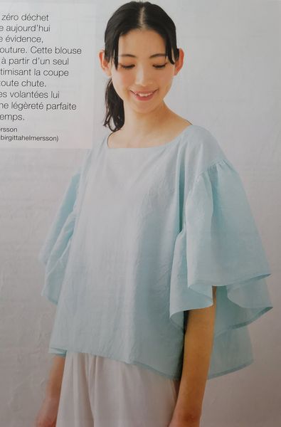 J’adore l’idée de coudre des vêtements sans chutes de tissus. Comme pour le modèle de cette blouse, qui dispose d’un tour de poitrine de 127 cm. Les manches courtes sont amples et froncées.