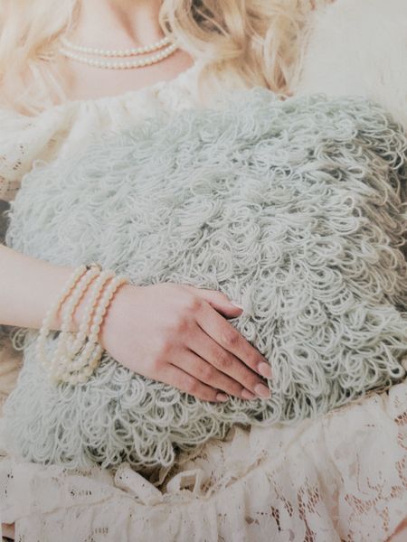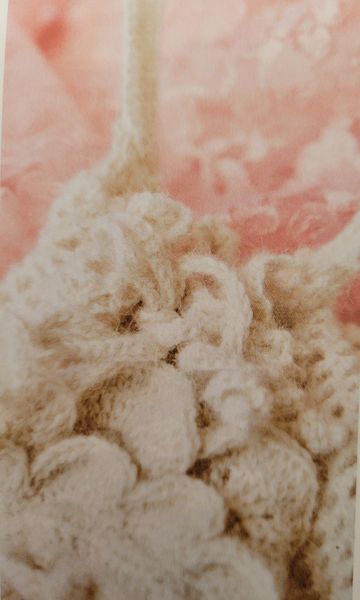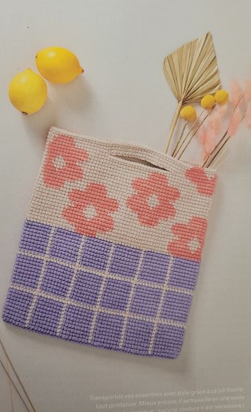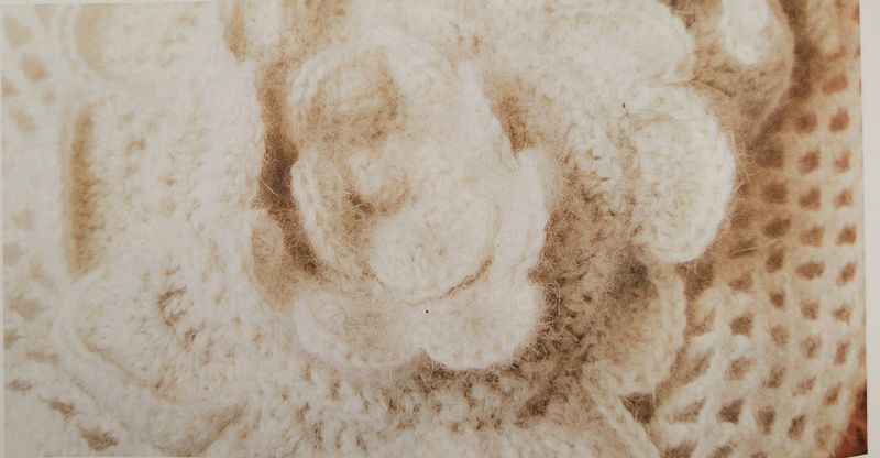 J’adore ce pochon, réalisé en alpaga. Ce fil apporte une énorme touche de douceur. Ce sac est garni d’une belle rose en relief sur un fond filet.