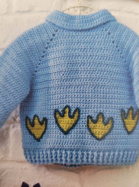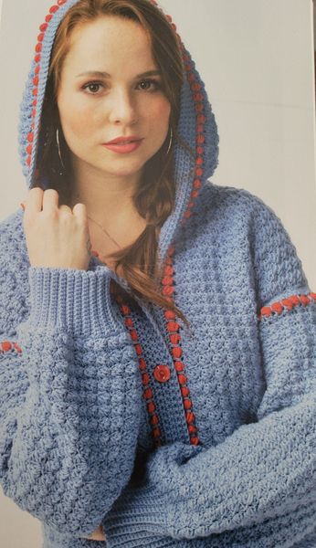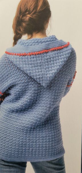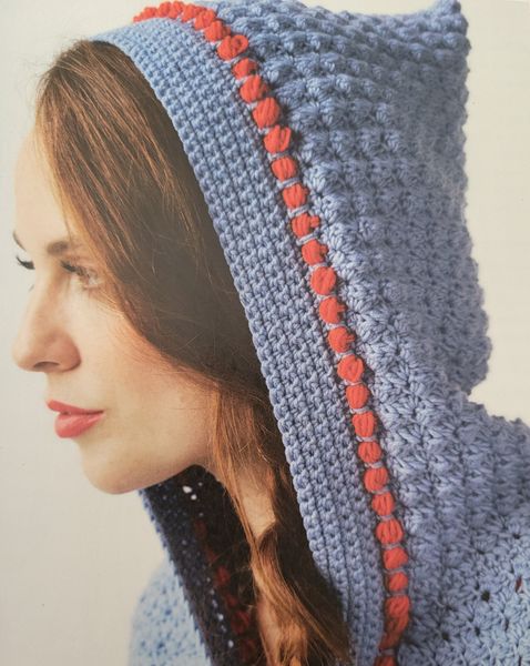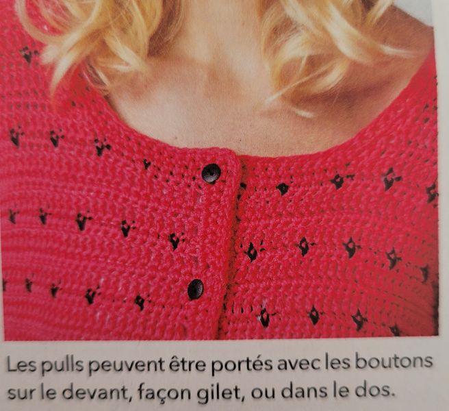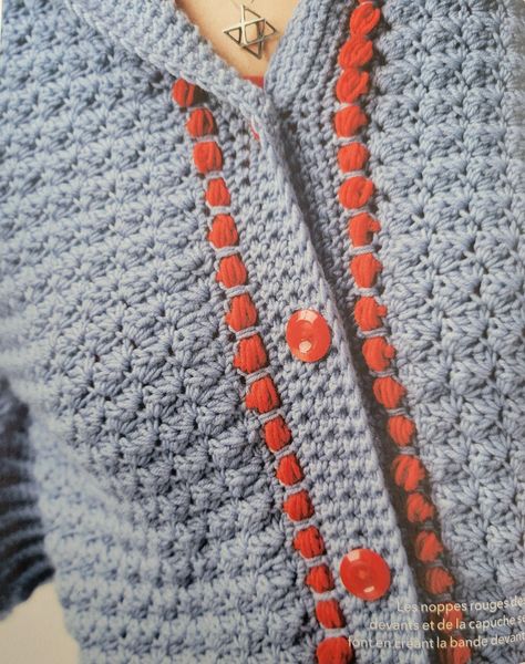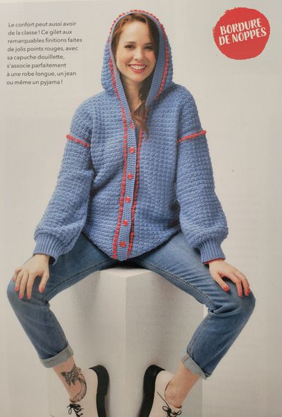 Je dois avouer que pour ce gilet à capuche, je voyais le fil rouge en ruban avec des pompons. Mais non, il s’agit de nopes réalisées en fil contrastant du gilet, ici en rouge. Cela structure le vêtement, on retrouve ces nopes en tête de manche et bord de parement ainsi que la capuche.