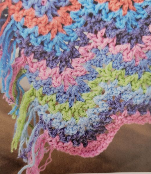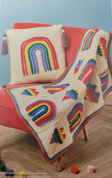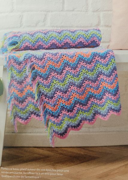 J’ai toujours eu une préférence pour les chevrons au crochet pour réaliser une couverture. Cela donne du mouvement, et ce n’est rien de le dire. L’association des couleurs de fils est sublime. Pas besoin de se prendre la tête à rentrer les fils en début et fin de rang, puisque le plaid posséde des franges.