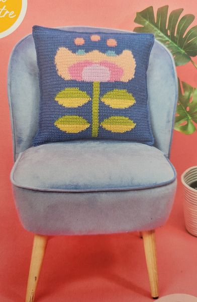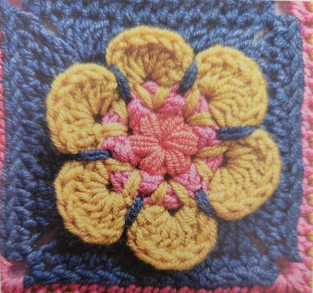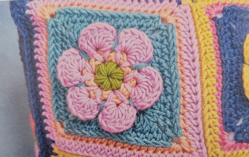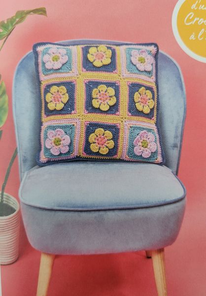 Ici aussi encore des fleurs, j’adore les fleurs en relief. Le modèle est plus simple que celui des fanions ou du sac. Chaque carré est coloré et bordé d’une rangée de brides contrastantes.